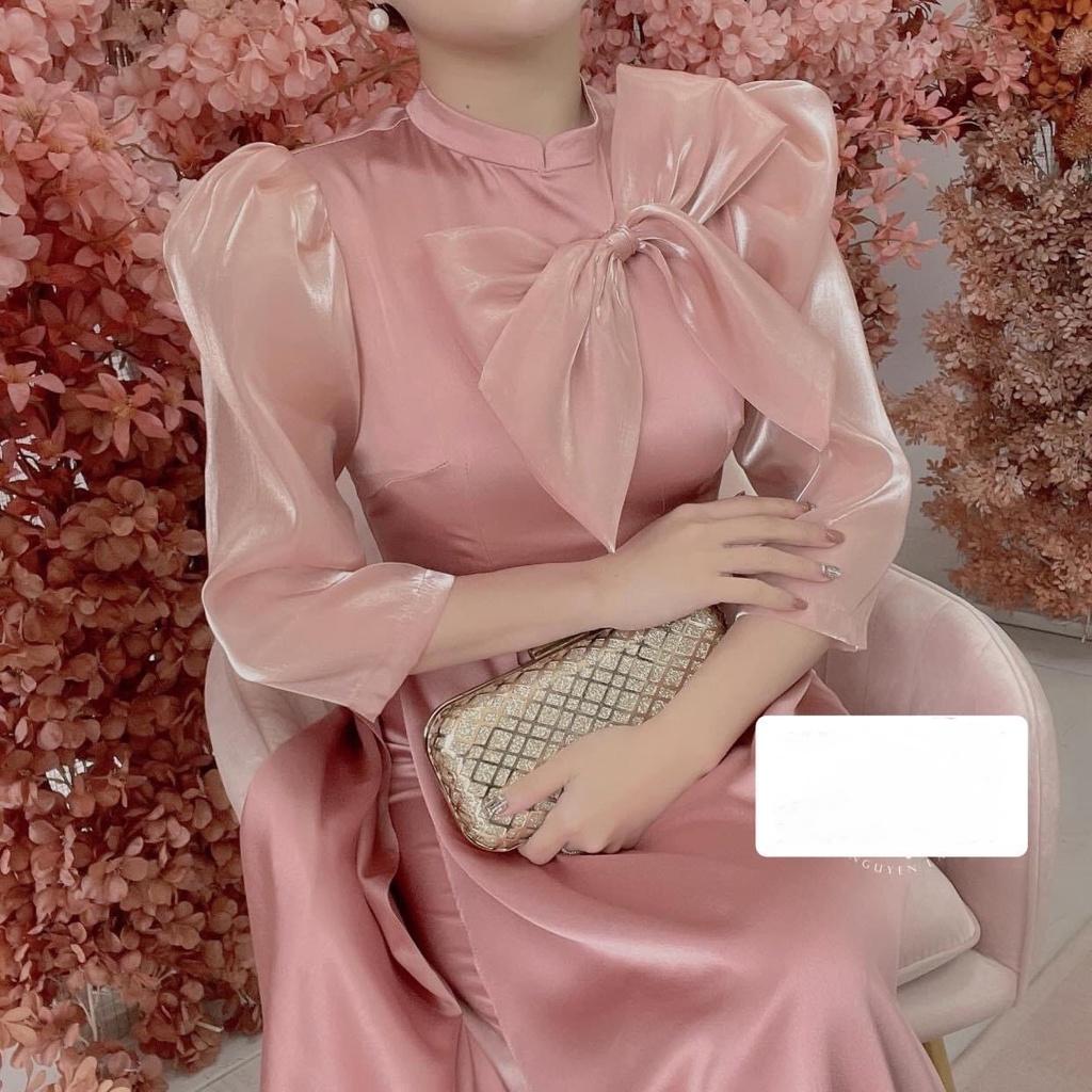 Áo Dài, Áo Cách Tân Đính Nơ Cổ Kết Hợp Tvai Bồng Thiết Kế Đơn Giản Mã A28
