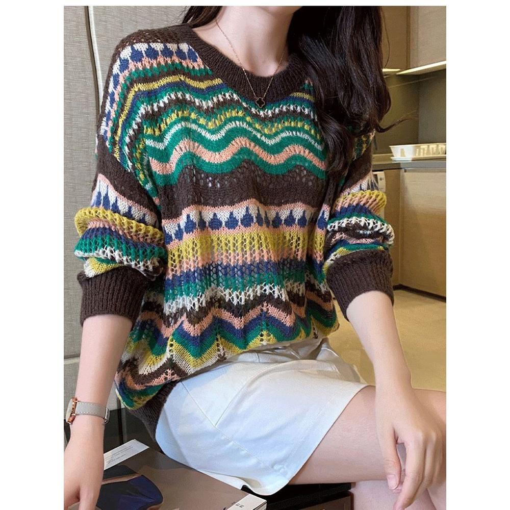Áo len lưới dập lỗ cổ tròn dệt kim mặc mùa thu đông trẻ trung họa tiết thổ cẩm mã VAA0445