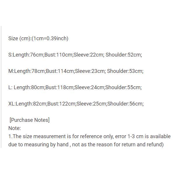 Thời gian giao hàng dự kiến cho sản phẩm này là từ 7-9 ngày Sản phẩm mới 100%. Dành cho: Nam và nữ Gói hàng bao gồm: 1 x áo Kích thước (cm) :( 1 cm = 0.39 inch) S: Chiều dài: 76cm; Ngực: 110cm; Tay áo: 22cm; Vai: 52cm; M: Chiều dài: 78cm; Ngực: 114cm; Tay áo: 23cm; Vai: 53cm; L: Chiều dài: 80cm; Ngực: 118cm; Tay áo: 24cm; Vai: 55cm; XL: Chiều dài: 82cm; Ngực: 122cm; Tay áo: 25cm; Vai: 56cm; Kích thước: Vui lòng cho phép sai số nhỏ do đo lường thủ công, sai số kích thước khoảng 1-3 cm. Cám ơn các bạn. (Tất cả các phép đo tính bằng cm và xin lưu ý 1 cm = 0.39 inch) Gợi ý để chọn kích thước phù hợp: 1. Sử dụng quần áo tương tự để so sánh với kích thước. 2. Chọn kích thước lớn hơn nếu kích thước của bạn giống với kích thước đo phẳng trong bảng kích thước Lưu ý: Do hiệu ứng ánh sáng màn hình, màu sắc thực tế của sản phẩm có thể có đôi chút khác biệt. Cám ơn bạn đã thông cảm. Giá sản phẩm trên Tiki đã bao gồm thuế theo luật hiện hành. Bên cạnh đó, tuỳ vào loại sản phẩm, hình thức và địa chỉ giao hàng mà có thể phát sinh thêm chi phí khác như phí vận chuyển, phụ phí hàng cồng kềnh, thuế nhập khẩu (đối với đơn hàng giao từ nước ngoài có giá trị trên 1 triệu đồng).....Sản phẩm này là tài sản cá nhân được bán bởi Nhà Bán Hàng Cá Nhân và không thuộc đối tượng phải chịu thuế GTGT. Do đó hoá đơn VAT không được cung cấp trong trường hợp này.