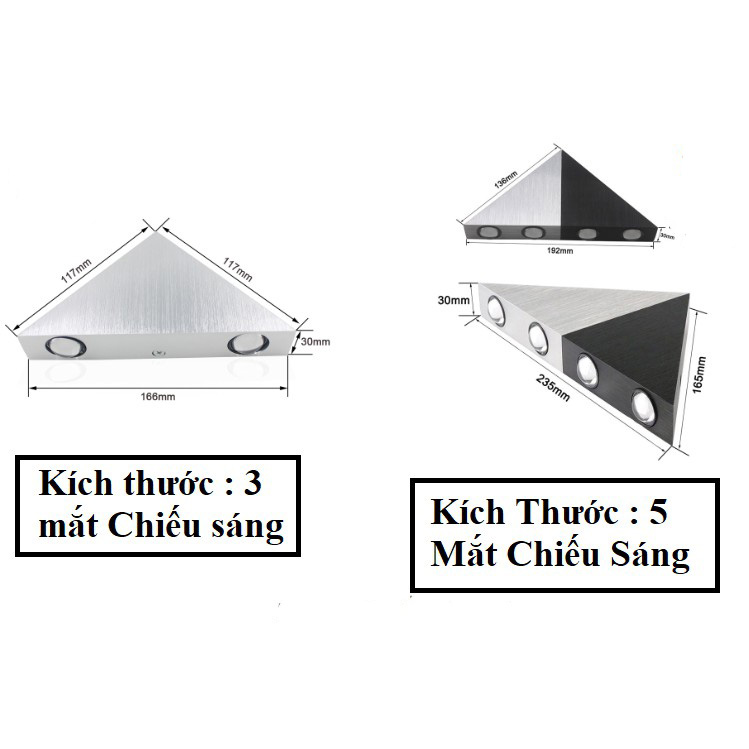 Ngày nay, đèn chiếu sáng với nhiều kiểu dáng thiết kế sang trọng, đẳng cấp như là đèn thả, đèn chùm, đèn mâm,… Tuy nhiên, để không gian phòng của bạn được đảm bảo cân bằng về ánh sáng và thẩm mỹ thì đèn tường là sản phẩm không thể thiếu. Công Suất : + 3 Mắt Led : 9w + 5 Mắt Led : 5w Điện Áp : 220v Kích Thước : + 3 Mắt Led : 166 x 117 x 30mm + 5 Mắt Led : 235 x 165 x 30mm Chất liệu : Hợp Kim Nhôm Màu sắc : Đen ; Đen Bạc Ánh Sáng Trắng / Vàng / Nhiều Màu Góc chùm 120 độ Tuổi thọ : 50000 giờ Diện tích chiếu sáng : ~ 5 - 10m2 Hướng sáng lên và xuống Sản phẩm chống thấm nước, bền bỉ với thời gian, có thể sử dụng ngoài trời Thông Lượng sáng: 90-100LM/W Đèn tường led hay còn gọi là đèn led gắn tường là một trong những sản phẩm thiết kế đẹp tạo nên điểm nhấn cho không gian nhà bạn. Đèn tường đa phần theo xu hướng và kiểu dáng hiện đại, làm nổi bật không gian xung quanh với ánh sáng vàng tạo cho không gian đầm ấm cho gia đình bạn. Đèn led gắn tường thường sử dụng chất liệu nhôm tĩnh điện với chip led nhập khẩu, cho tuổi thọ chiếu sáng lên tới 50.000h. Ứng dụng Phòng khách, phòng đọc sách, nội thất, nhà bếp, nhà hàng, trung tâm mua sắm, quán cà phê, phòng trưng bày, cầu thang, lối đi, Giá sản phẩm trên Tiki đã bao gồm thuế theo luật hiện hành. Bên cạnh đó, tuỳ vào loại sản phẩm, hình thức và địa chỉ giao hàng mà có thể phát sinh thêm chi phí khác như phí vận chuyển, phụ phí hàng cồng kềnh, thuế nhập khẩu (đối với đơn hàng giao từ nước ngoài có giá trị trên 1 triệu đồng).....