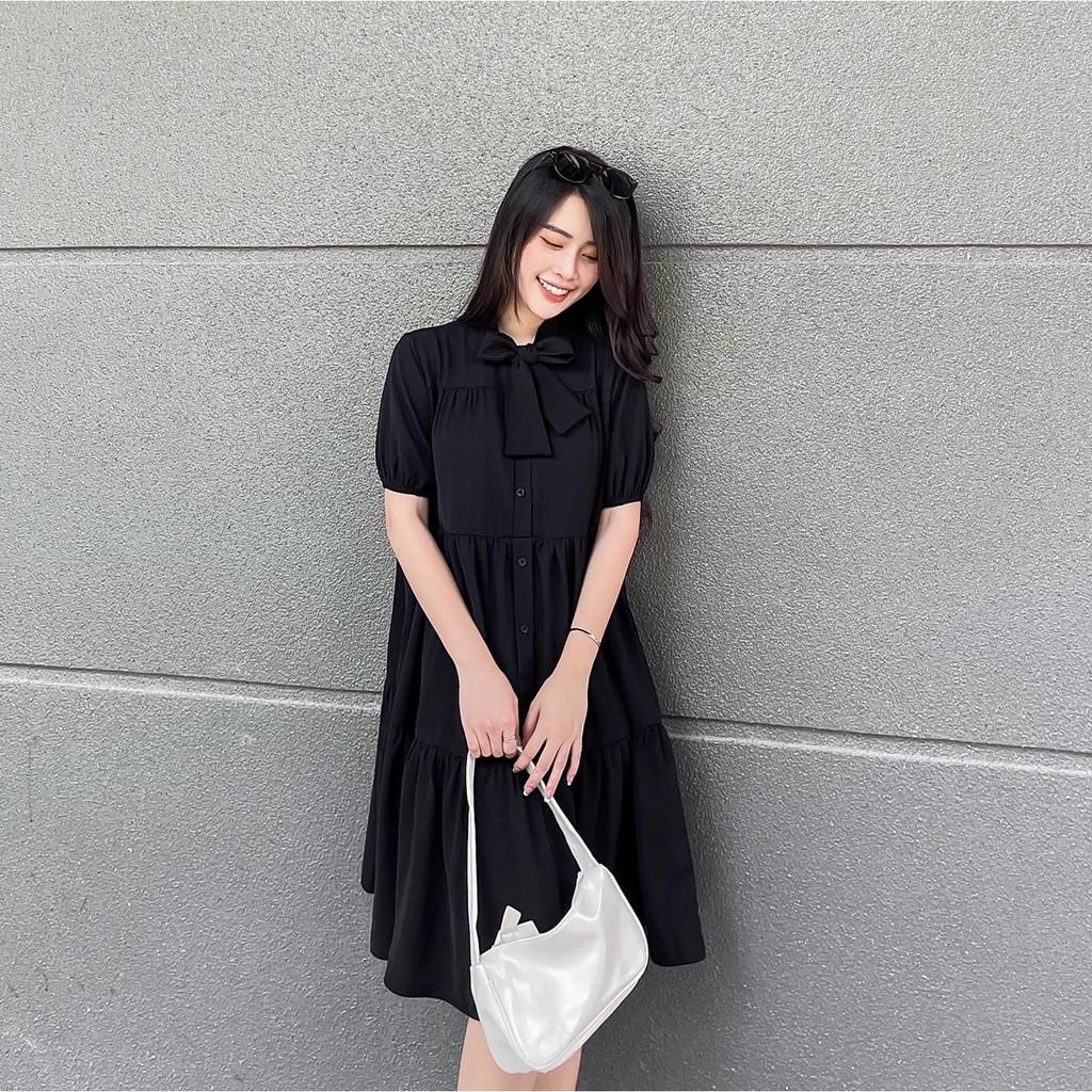 ĐẦM DỰ TIỆC BABYDOLL LỤA 2 LỚP CỔ CỘT NƠ DÁNG XÒE TAY LỠ