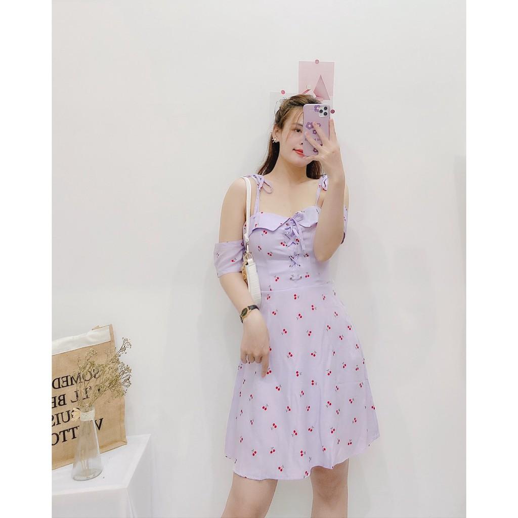 ĐẦM HOA LỤA TRỄ VAI TÍM CHERY MẮC CÁO DÁNG XÒE CÓ BO CHUN EO-hình thật shop chụp