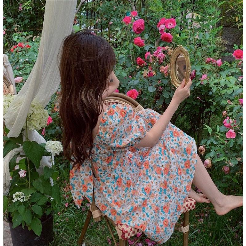 Đầm hoa xoè tiểu thư tay bồng thắt nơ lưng 2021