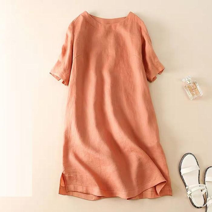 Đầm suông linen cổ tròn tay lỡ xẻ tà gấu, thời trang hè thu 2021