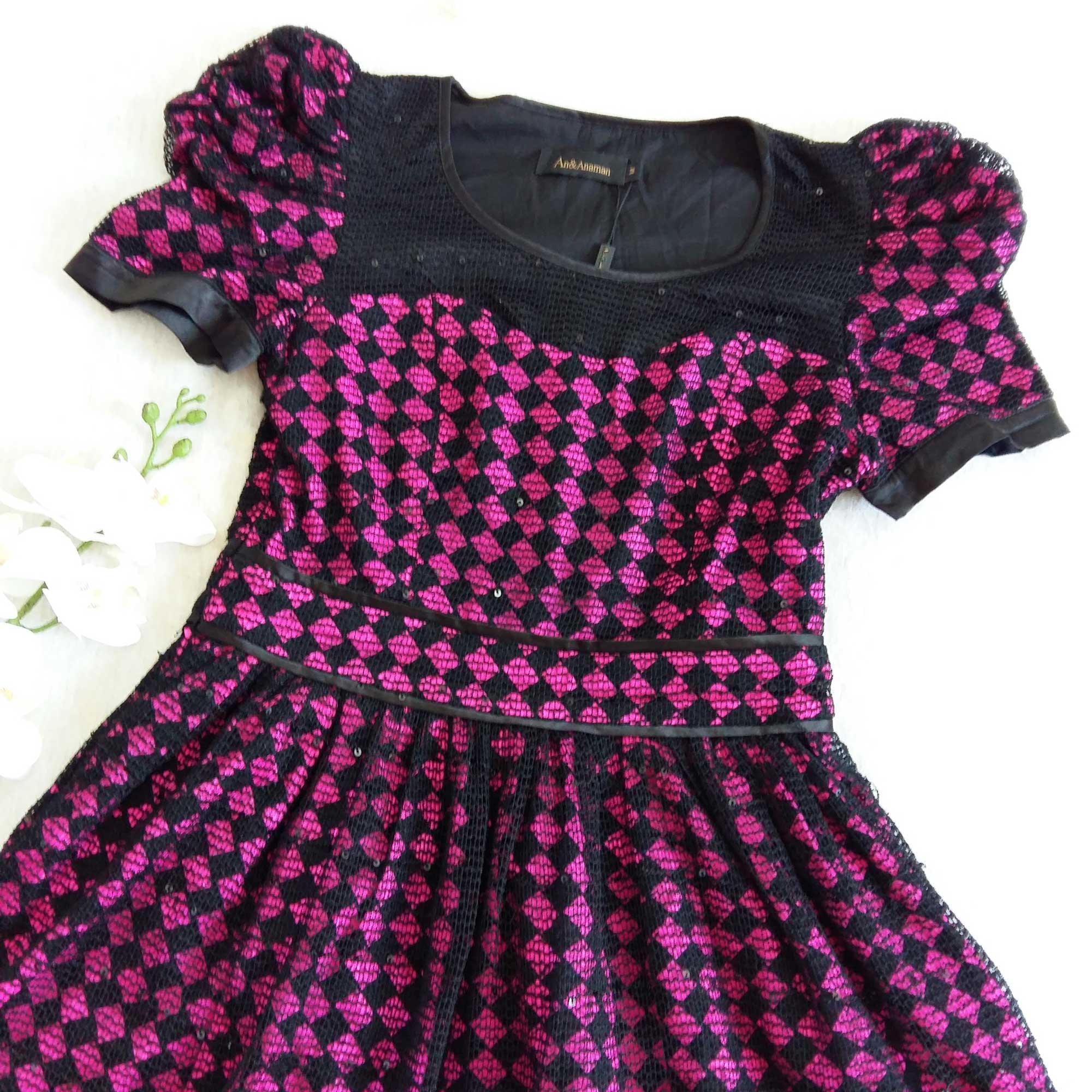 Đầm xòe công chúa đính kim saKiểu dáng đầm xòe có đính kim sa ánh nhũ.Tay áo phồng kiểu lồng đèn.Có khóa kéo giọt nước sau lưng.Đầm thiết kế 1 lớp ren lưới màu đen phủ bên ngoài, lớp ren này có đ...