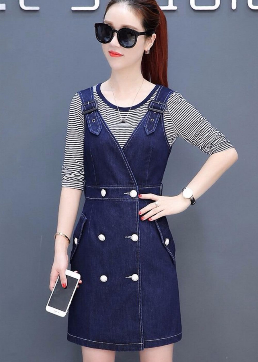 Đầm Yếm Jean Nữ 2 Hàng Nút D776 - Xanh