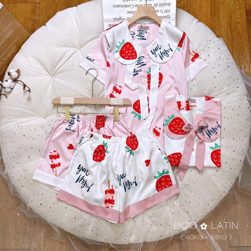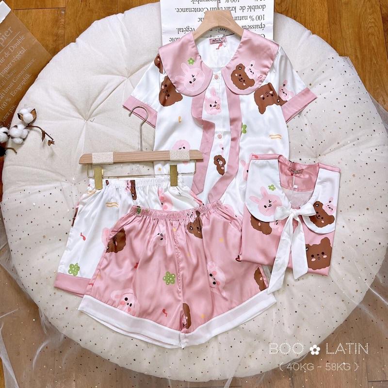 Đồ ngủ lụa latin cao cấp pijama áo cột nơ hoạ tiết quần đùi freesize 42-58kg