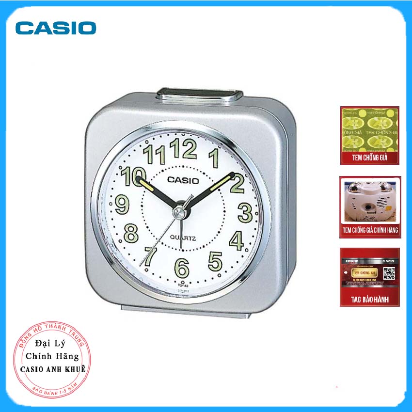 Đồng hồ báo thức để bàn Casio TQ-143S-8DF có thiết kế đơn giản thanh lịch và nhỏ gọn hiện thị đầy đủ tính năng xem giờ, báo thức có dạ quang trên mặt số và kim đồng hồ, đặc biệt đồng hồ còn được trang bị thêm đèn chiếu sáng ở bên trong góc mặt đồng hồ. Đồng hồ có màu sắc trang nhã thiết kế tinh tế trang trí đẹp thêm cho bàn học, bàn làm việc. Thông số kỹ thuật Chất liệu vỏ / khung: Nhựa Đèn chiếu sáng góc mặt đồng hồ Dạ quang Báo thức âm thanh bíp Chức năng báo lại Độ chính xác: ± 60 giây mỗi tháng Xấp xỉ Tuổi thọ pin: 12 tháng với pin R6P Kích thước vỏ: 7.7×7.6×3.8 cm Trọng lương 99g Bộ sản phẩm gồm: 01 đồng hồ dán tem chính hãng Anh Khuê 01 hộp đựng Casio Sách HDSD Giá sản phẩm trên Tiki đã bao gồm thuế theo luật hiện hành. Bên cạnh đó, tuỳ vào loại sản phẩm, hình thức và địa chỉ giao hàng mà có thể phát sinh thêm chi phí khác như phí vận chuyển, phụ phí hàng cồng kềnh, thuế nhập khẩu (đối với đơn hàng giao từ nước ngoài có giá trị trên 1 triệu đồng).....