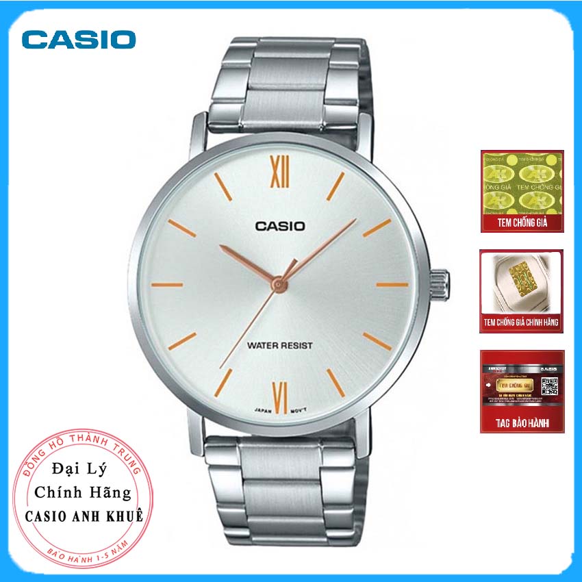 Đồng hồ nữ Casio LTP-VT01D-7BUDF có thiết kế mỏng đơn giản và thanh lịch .Mặt trắng và vạch kim chỉ giờ mạ vàng hồng kiểu classic. Đồng hồ thích hợp với mọi quý cô chuộng phong cách thanh lịch và sang trọng Đặc điểm kỹ thuật- Vỏ / vỏ: mạ Ion- Khóa bấm chốt gập ba - Dây thép không gỉ- Mặt kính pha khoáng- Chống nước 3ATM- Tính thời gian thông thường - Analog: 3 tay (giờ, phút, giây)- Độ chính xác: ± 20 giây mỗi tháng- Khoảng Tuổi thọ pin: 3 năm trên SR626SW- Kích mặt đồng hồ: 34 mm Bộ sản phẩm gồm: + 01 đồng hồ dán tem chính hãng Anh Khuê + 01 hộp đựng Casio + Thẻ bảo hành chính hãng CasioBảo hành chính hãng Casio 1 năm máy và 18 tháng pinGiá sản phẩm trên Tiki đã bao gồm thuế theo luật hiện hành. Bên cạnh đó, tuỳ vào loại sản phẩm, hình thức và địa chỉ giao hàng mà có thể phát sinh thêm chi phí khác như phí vận chuyển, phụ phí hàng cồng kềnh, thuế nhập khẩu (đối với đơn hàng giao từ nước ngoài có giá trị trên 1 triệu đồng).....