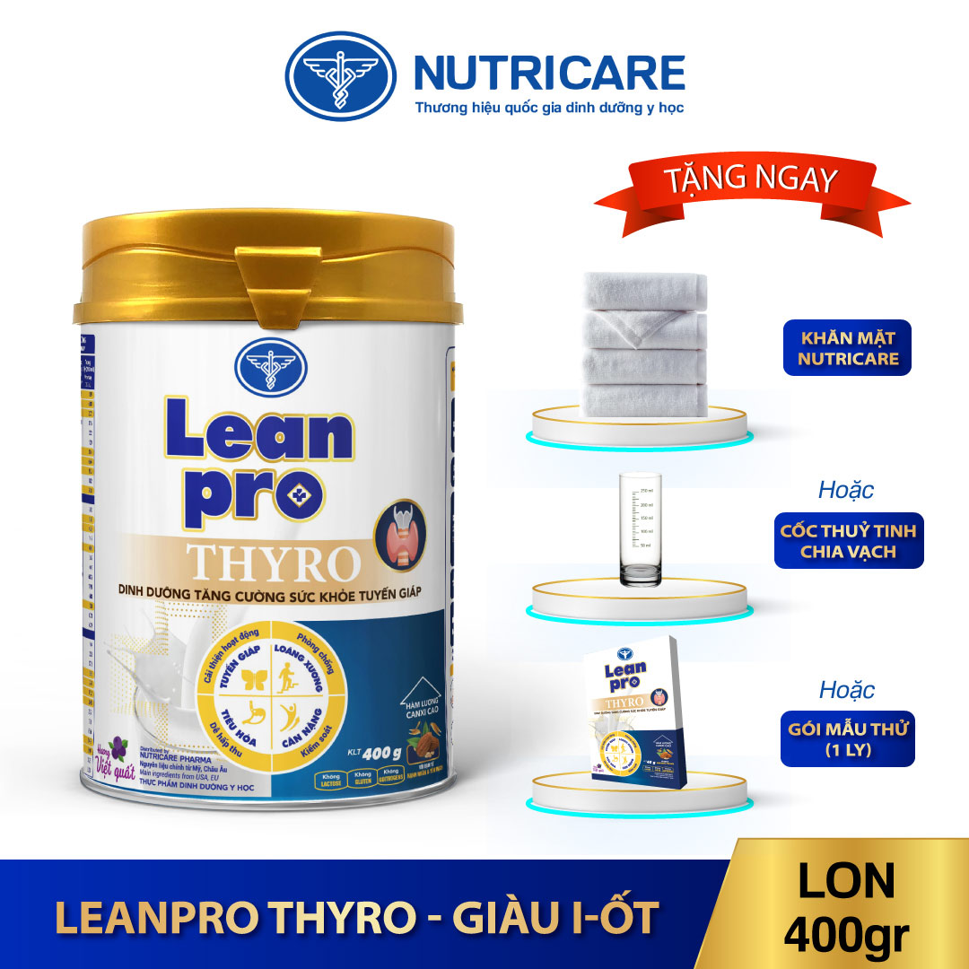 Leanpro Thyro dinh dưỡng chuyên biệt giàu I-ốt, Selen giúp cải thiện hormone tuyến giáp, đặc biệt với hệ SLIM CARE độc quyền giúp kiểm soát cân nặng, giảm căng thẳng mệt mỏi, nâng cao thể trạng toàn diện. Đối tượng: Dinh dưỡng chuyên biệt cho người sau phẫu thuật tuyến giáp hoặc người bệnh suy giáp. Công dụng: Cung cấp vi chất I-ốt, Selen hàm lượng phù hợp kích thích hoạt động của hormone tuyến giáp, điều hòa hoạt động bất thường của tuyến giáp. Cung cấp Canxi, Vitamin D3 hàm lượng cao giúp giảm nguy cơ loãng xương. Với tinh chất nghệ Nano Curcumin và Omega 3 giàu EPA, DHA hỗ trợ chống viêm nhiễm lan rộng, chống oxy hóa trong quá trình điều trị rối loạn tuyến giáp. Hệ SLIM CARE giảm béo ít năng lượng với nguồn đạm từ hạnh nhân và yến mạch cùng hệ bột đường ăn kiêng giúp kiểm soát tình trạng tăng cân. Bổ sung đạm quý Lactium cùng bộ đôi Mg - B6 được chứng minh khoa học giúp giảm mệt mỏi, cải thiện giấc ngủ. Chất xơ hòa tan (FOS/Inulin) tốt cho tiêu hóa, giảm tình trạng táo bón. (*) Sử dụng 3 ly/ngày. Hướng dẫn sử dụng: - Cho từ từ 40g Leanpro Thyro (4 muỗng gạt) vào 180ml nước đun sôi để ấm khoảng 45-50 độ C, khuấy đều được 210ml dung dịch.- Hỗn hợp sau khi pha sử dụng hết trong vòng 3 giờ.- Sử dụng 2-3 ly/ngày với chế độ ăn bổ sung, dùng 7 ly/ngày với chế độ ăn hoàn toàn hoặc theo hướng dẫn của bác sỹ/chuyên gia dinh dưỡng.- Sử dụng cho người bệnh dưới sự giám sát của nhân viên y tế.- Có thể dùng nuôi ăn qua xông. Khi dùng qua xông đặc biệt phải theo hướng dẫn của bác sỹ/chuyên gia dinh dưỡng.Giá sản phẩm trên Tiki đã bao gồm thuế theo luật hiện hành. Bên cạnh đó, tuỳ vào loại sản phẩm, hình thức và địa chỉ giao hàng mà có thể phát sinh thêm chi phí khác như phí vận chuyển, phụ phí hàng cồng kềnh, thuế nhập khẩu (đối với đơn hàng giao từ nước ngoài có giá trị trên 1 triệu đồng).....