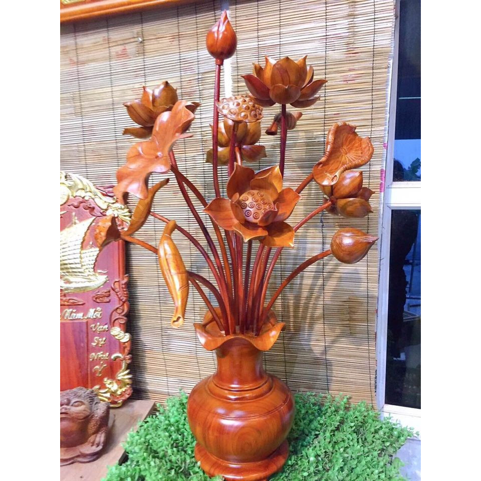 Bình hoa sen gỗ hương cao cấp Sản phẩm là một bình cả hoa như hình Chất liệu: Gỗ hương Cam kết bán hàng chất lượng gỗ thịt 100% Kích thước DxRxC: 45x45x80cm Bình hoa sen gỗ hương có thể dùng trang trí bàn thờ, phòng khách tạo nên sự sang trọng cho ngôi nhà của bạn Từ xưa đến nay, hoa sen vẫn là biểu tượng tôn thờ điển hình trong Phật giáo. Trong thờ cúng phong thủy, hoa sen tượng trưng cho sự thanh cao, thoát tục. Giúp con người gỡ bỏ mọi ưu phiền, để tĩnh tâm, an hưởng hạnh phúc. Lọ Hoa sen gỗ được bày trên bàn thờ của mỗi gia đình, dòng họ hay trong Đình, Chùa để thờ cúng ông bà tổ tiên hay bình hoa sen gỗ còn được trang trí trong phòng khách, phòng làm việc. Mẫu bình hoa sen làm bằng gỗ hương để trên bàn thờ cúng gia tiên, với 11 bông hoa bao gồm cả nụ hoa, hoa sen đang nở và Đài sen biểu thị cho sự đầy đủ và trường tồn. Đặc biệt bình hoa sen được sơn Pu giúp cho sản phẩm được bóng đẹp và bền màu. Là sản phẩm phong thủy mang lại may mắn và thịnh vượng cho gia chủ Sản phẩm được các nghệ nhân làm hoàn toàn thủ công bởi đôi bàn tay khéo léo Từng cánh hoa sen được đục, mài nhẵn bóng tạo nên một bông hoa vô cùng sinh động Bình hoa hài hòa, cân đối tạo thế vững chãi cho cả lọ hoa Sản phẩm thể hiện sự tinh sảo và tỉ mỉ của người thợ thủ công, tạo lên giá trị sản phẩm. Giá sản phẩm trên Tiki đã bao gồm thuế theo luật hiện hành. Bên cạnh đó, tuỳ vào loại sản phẩm, hình thức và địa chỉ giao hàng mà có thể phát sinh thêm chi phí khác như phí vận chuyển, phụ phí hàng cồng kềnh, thuế nhập khẩu (đối với đơn hàng giao từ nước ngoài có giá trị trên 1 triệu đồng).....