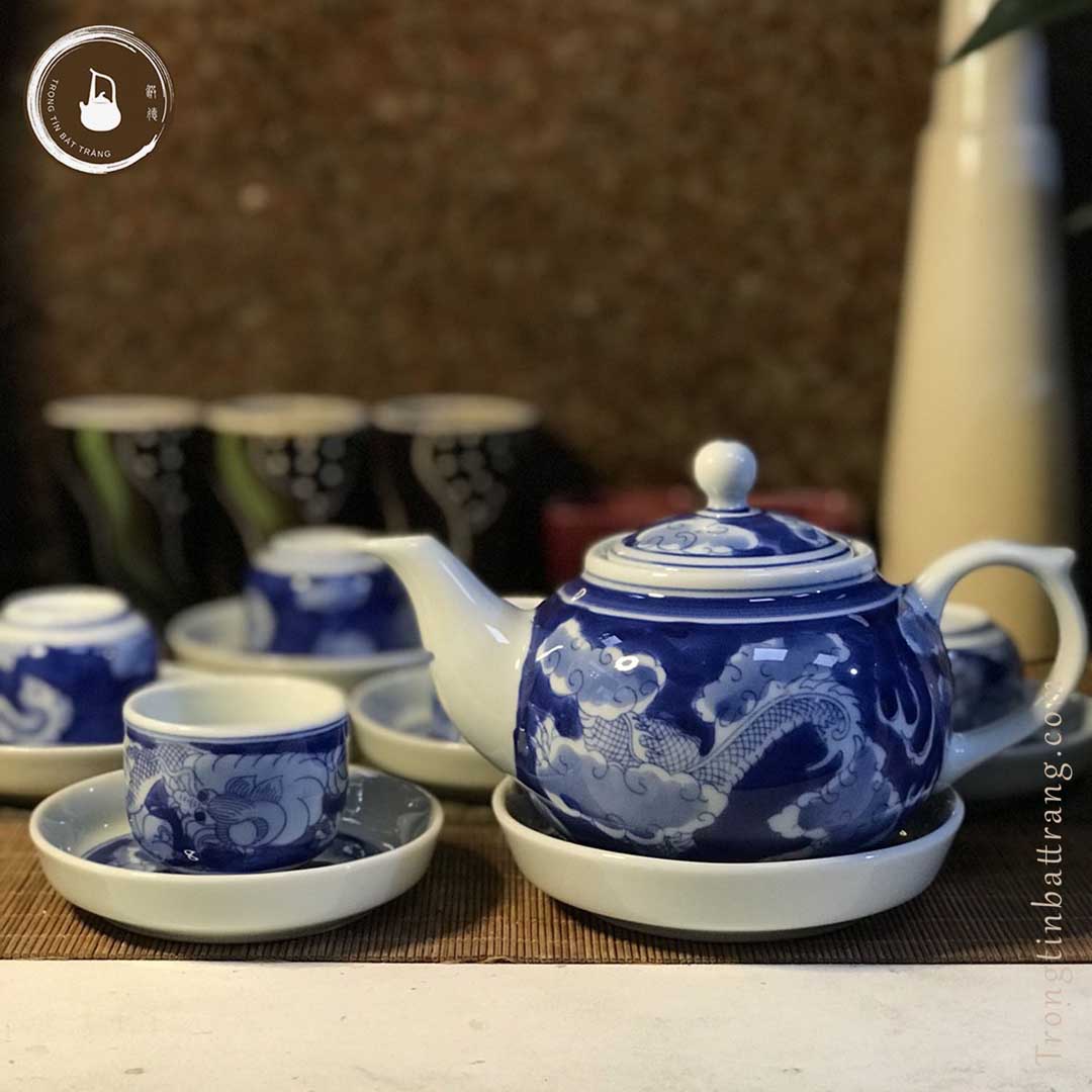 ATA 21 Bộ Ấm Chén Gốm Sứ Men Lam Bát Tràng Họa Tiết Long Ẩn Dáng Thủy Bình Dung Tích 400mlTHÔNG TIN SẢN PHẨM:- Thành Phần: Ấm, Chén, Tách Lót(1)Ấm: 01 chiếc(2) Chén: 06 chiếc(3) Tách Lót: 07 chiế...