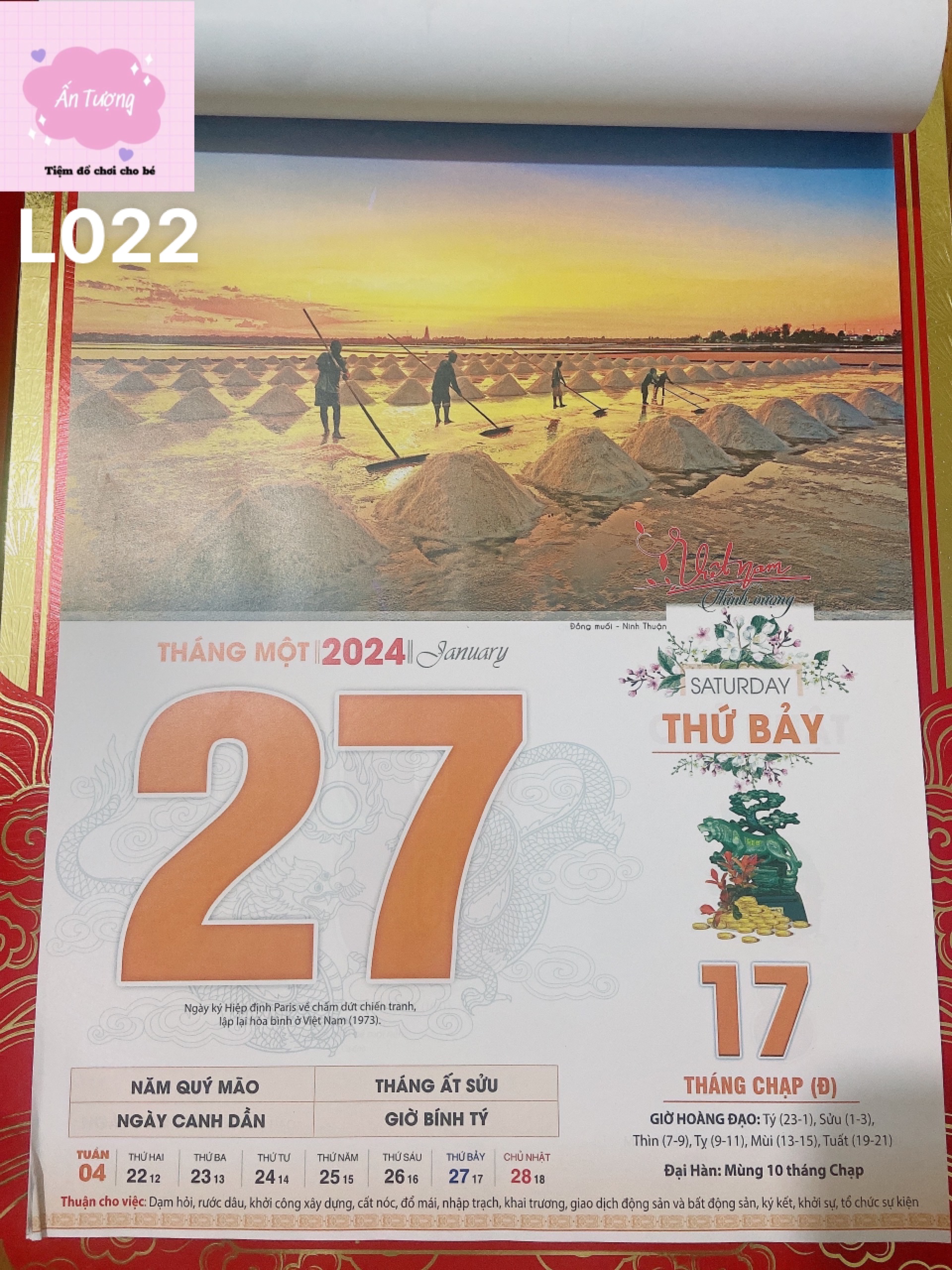 Bộ lịch Giáp Thìn 2024 - Lịch Bloc Siêu Cực Đại (35x50cm)- Lịch Giáp Thìn chủ đề " Việt Nam Thịnh Vượng”Lịch Tết 2024 là một món quà không thể thiếu trong những ngày năm hết tết đến. Hãy trao gửi những lời chúc tốt đẹp của mình thông qua những bộ lịch Tết với mong muốn đón một năm mới đầy may mắn, bình an, tài lộc viên mãn, công việc làm ăn tấn tới, thuận buồm xuôi gió. Bộ lịch Giáp Thìn 2024 - Lịch Bloc Siêu Cực Đại (35x50cm)- Lịch Giáp Thìn chủ đề " Việt Nam Thịnh Vượng” là dòng sản phẩm mới nhất tại Ấn Tượng Shop trong năm nay, với tính thẩm mỹ được đánh giá cao sẽ mang lại không gian tràn ngập sắc xuân cho gia đình bạn và là một món quà vô cùng ý nghĩa dành cho người thân, đồng nghiệp.Thông tin sản phẩm: Mã sản phẩm: L022 Bộ Lịch gồm: Hộp đựng lịch, Túi đựng lịch, Khánh Lịch, Bloc lịch, phụ kiện đi kèm QUY CÁCH KỸ THUẬT:► Kích thước bloc lịch: 35x50cm► Ruột Bloc: Giấy Couche Matt 60.2gsm► Áo Bloc: In 7 màu theo công nghệ Metalize, hiệu ứng 3D► Bìa treo: In 7 màu theo công nghệ Metalize bôi trên ván MDF, hiệu ứng và bề nổi 3D► Hộp lịch: Âm dương, In 7 màu theo công nghệ Metalize, hiệu ứng và bề nổi 3D► Túi Đựng Lịch: Túi vải in hoa văn vàng► Nẹp chữ I & ốc đầu tròn Thông tin sản xuất- Xuất Xứ : Việt Nam- Nhà Xuất Bản : Thông Tin và Truyền Thông- Có " Tem chống hàng giả " Quý công ty, cơ quan, trường học, đại lý,cá nhân có nhu cầu đặt hàng liên hệ ngay Shop. Địa chỉ: cơ sở 1: 8 lạc long quân, Tây Hồ, Hà NộiCơ sở 2: 87 phú lương, Hà Đông, Hà Nội03583310860837120091Ấn Tượng Shop- Đại lý bán buôn, bán lẻ lịch Tết 2024 trân trọng giới thiệu!.....................................……………................................. Giá sản phẩm trên Tiki đã bao gồm thuế theo luật hiện hành. Bên cạnh đó, tuỳ vào loại sản phẩm, hình thức và địa chỉ giao hàng mà có thể phát sinh thêm chi phí khác như phí vận chuyển, phụ phí hàng cồng kềnh, thuế nhập khẩu (đối với đơn hàng giao từ nước ngoài có giá trị trên 1 triệu đồng).....Sản phẩm này là tài sản cá nhân được bán bởi Nhà Bán Hàng Cá Nhân và không thuộc đối tượng phải chịu thuế GTGT. Do đó hoá đơn VAT không được cung cấp trong trường hợp này.