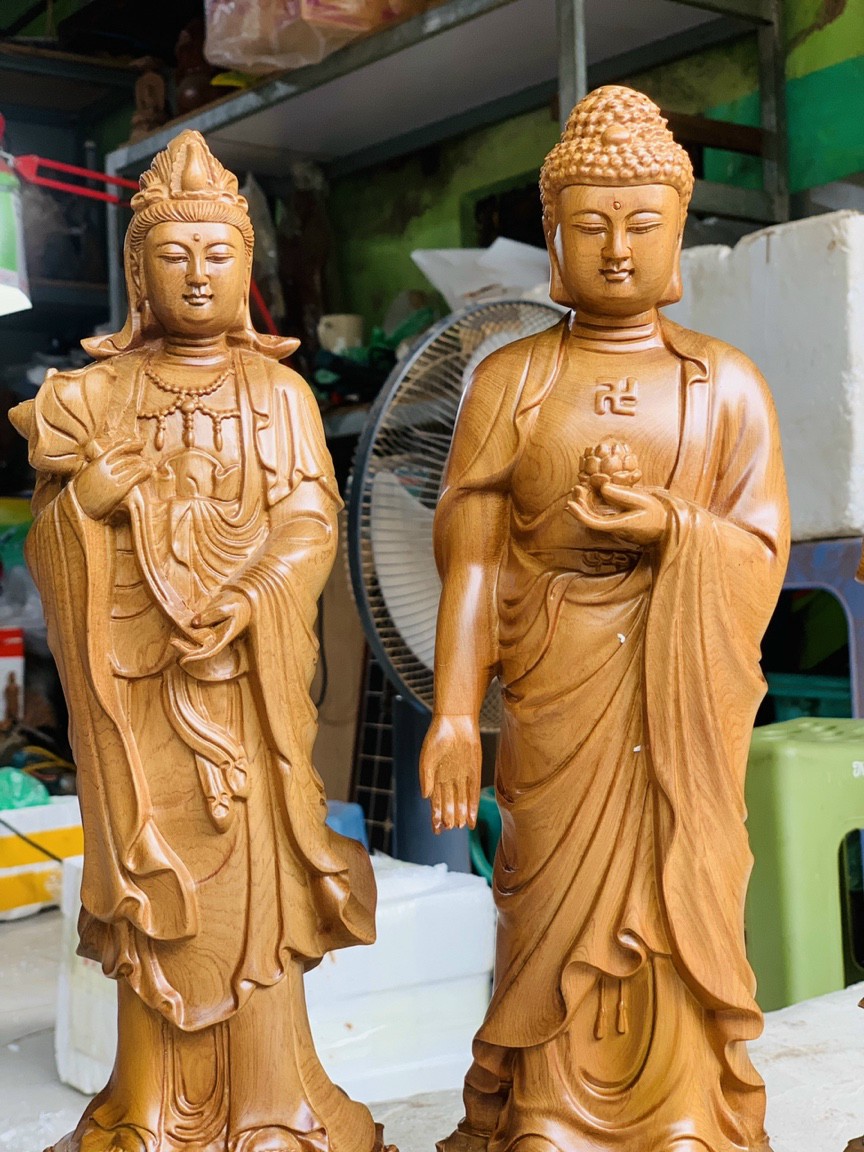Bộ tượng phật tam thánh bằng gỗ bách xanh thơm nức kt cao 50×15×15cm