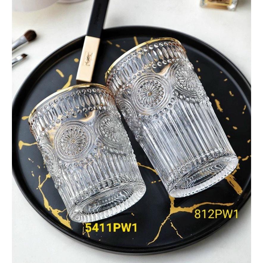 Cốc thủy tinh . cốc thủy tinh viền vàng vân họa tiết mặt trời, chịu nhiệt