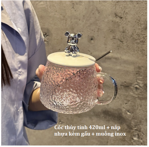 Cốc thuỷ tinh chịu nhiệt gấu bear brick phong cách bắc âu, Ly thuỷ tinh 420ml kèm nắp và thìa GD750-LyBrick