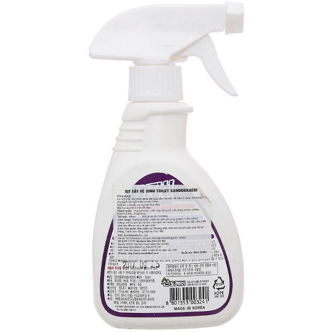 THÔNG TIN SẢN PHẨM Tên sản phẩm : Xịt Tẩy Vệ Sinh TOILET SANDOKKAEBI Hàn QuốcCông dụng : Là nước tẩy rửa toilet dạng bọt giúp tẩy rửa các vết bẩn ố vàng, sử dụng cho toilet , bệ ngồi toilet , sàn toilet.Thành phần : Hypochlorite, chất hoạt động bề mặt, NaOH,..Cách dùng : - Trong bệ toalet 3 lần xịt- Sàn và xung quanh : 3 lần xịt/m2Kích thước : 19 x 9 x 5,5 cmQuy cách đóng gói : Chai xịtDung tích : 300mlTrọng lượng : 400gXuất xứ : Sandokkaebi - Hàn QuốcNgày sản xuất : In trên bao bìHạn sử dụng : 3 năm kể từ ngày sản xuất Cuộc sống hiện đại với nhiều sản phẩm tiện ích giúp mọi việc trở nên đơn giản và nhanh gọn hơn.Xịt Tẩy Vệ Sinh TOILET SANDOKKAEBI Hàn Quốcvới công nghệ tiên tiến dễ dàng đánh bay mọi vết bẩn toalet , bệ ngồi , sàn toalet giúp toalet của bạn luôn thơm tho sạch sẽDiệt 99% vi khuẩn có hại , khử sạch mùi hôi khó chịu , mùi hương thơm mát dễ chịu. Chú ý: Để xa tầm tay trẻ em. Tránh tiếp xúc với mắt Bảo quản: Nơi khô ráo thoáng mát và luôn dựng chai đóng thẳng , tránh ánh sáng mặt trời trực tiếp Giá sản phẩm trên Tiki đã bao gồm thuế theo luật hiện hành. Bên cạnh đó, tuỳ vào loại sản phẩm, hình thức và địa chỉ giao hàng mà có thể phát sinh thêm chi phí khác như phí vận chuyển, phụ phí hàng cồng kềnh, thuế nhập khẩu (đối với đơn hàng giao từ nước ngoài có giá trị trên 1 triệu đồng).....