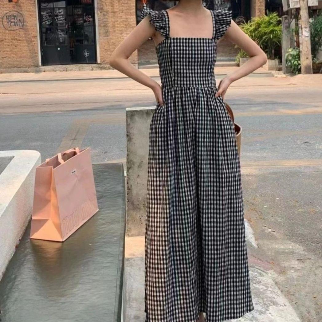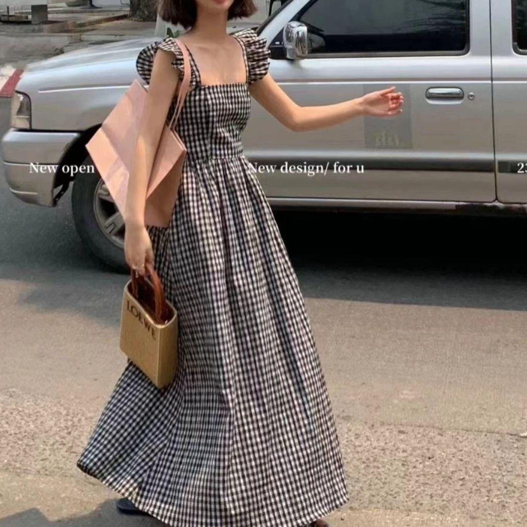 CHENGRUI 2023 Mùa hè Pháp Vintage kiểm tra Flying Sleeve Sling Dress Pleated thắt lưng hiển thị gầy Square Neck Dress cho phụ nữ