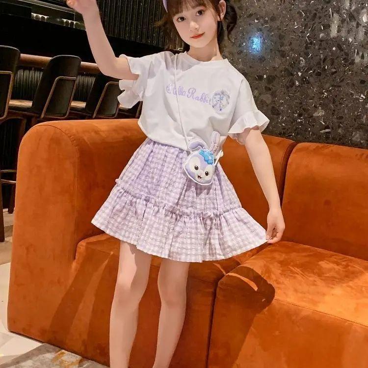 CHENGRUI Cô gái ăn mặc mùa hè phong cách phương Tây 2022 trẻ em Hàn Quốc mùa hè lưới đỏ kẻ sọc ngắn tay áo hai mảnh váy