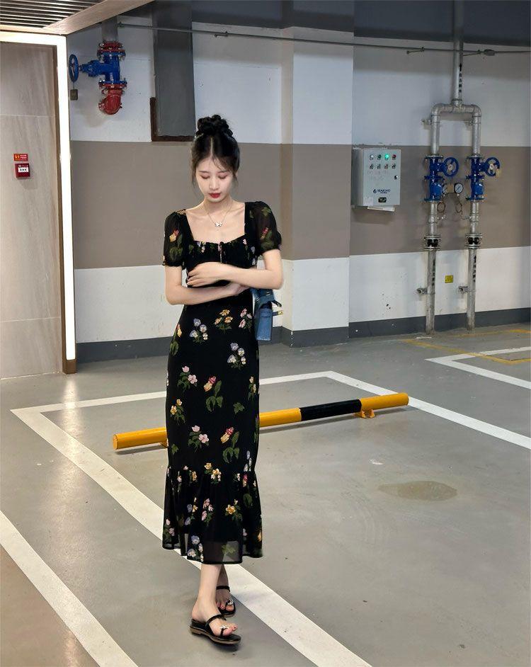 CHENGRUI Pháp Vintage vuông cổ in tay áo ngắn đuôi cá đầm nữ tính siêu tiên váy dài màu đen hoa chiffon đầm