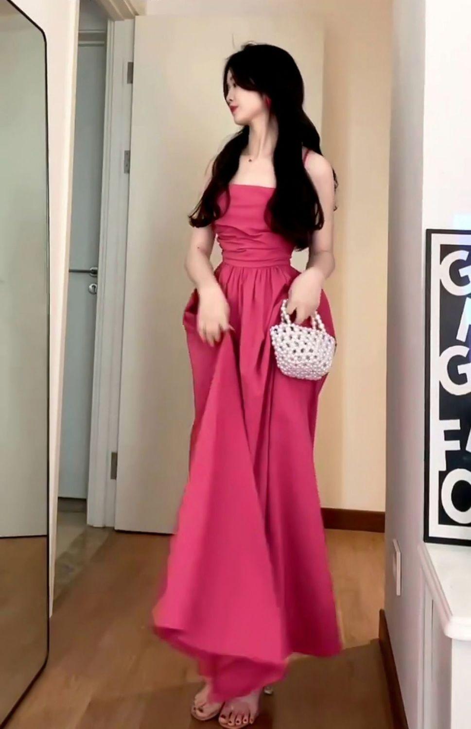 CHENGRUI Tea Break French Rose Sling Dress Trẻ em mùa hè 2023 Thắt lưng lộ ra váy dài nghỉ mát bên bờ biển gầy