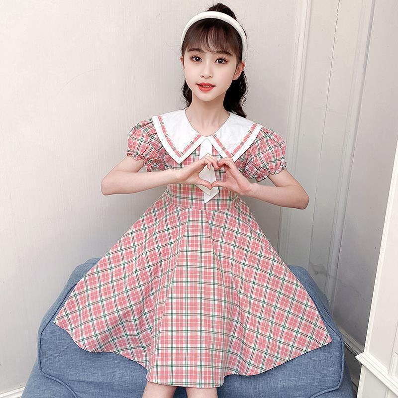 CHENGRUI Váy mùa hè cho bé gái 2023 Trẻ em cổ áo hải quân Hàn Quốc váy kẻ sọc đỏ