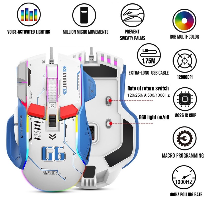 - Chuột Gaming Macro G6 Led RGB 12800DPI - Thiết kế công thái học , chống đau mỏi cổ tay khi dùng lâu - Độ Nhạy DPI : 12800 - 6 mức điều chỉnh - Return Rate: 125/250/500/1000Hz - Light effect: 13 chế độ - Hỗ trợ phần mềm macro - Moving Speed: 60inch/s - Refresh Rate: 7000FPS - Số Key : 10 - Tuổi thọ Switch : 20 triệu lần nhấn - Dây dài 1.75m - Chất liệu : ABS , Aluminum - Trọng Lượng : 142g - Kích thước: 129 x 82 x 42mm - Thiết bị hỗ trợ : PC , Laptop , điện thoại , máy tính bảng , Smart TV android - Hệ điều hành hỗ trợ : Window , Android , Ios 13 trở lên , Mac - Lưu ý : để kết nối với Điện thoại , máy tính bảng khách cần có thêm Đầu chuyển OTG ( Sản phẩm không kèm Đầu chuyển OTG ). - Đặc biệt chuột có chế độ Gaming hỗ trợ các game bắn súng như CS-Go - Bật tắt chế độ gaming bằng cách nhấn key số 10 ( đèn led chớp báo chuyển) - Trong game , khi bạn click chuột trái để bắn thì hồng tâm sẽ bị bật lên ở mỗi phát bắn nên sẽ khó nhắm chính xác - Với chế độ gaming , con trỏ chuột sẽ tự kéo xuống mỗi khi bạn click chuột trái để bắn , làm cho hồng tâm giảm độ rung giật , gần như giữ nguyên vị trí , tạo lợi thế rất lớn trong game Giá sản phẩm trên Tiki đã bao gồm thuế theo luật hiện hành. Bên cạnh đó, tuỳ vào loại sản phẩm, hình thức và địa chỉ giao hàng mà có thể phát sinh thêm chi phí khác như phí vận chuyển, phụ phí hàng cồng kềnh, thuế nhập khẩu (đối với đơn hàng giao từ nước ngoài có giá trị trên 1 triệu đồng).....
