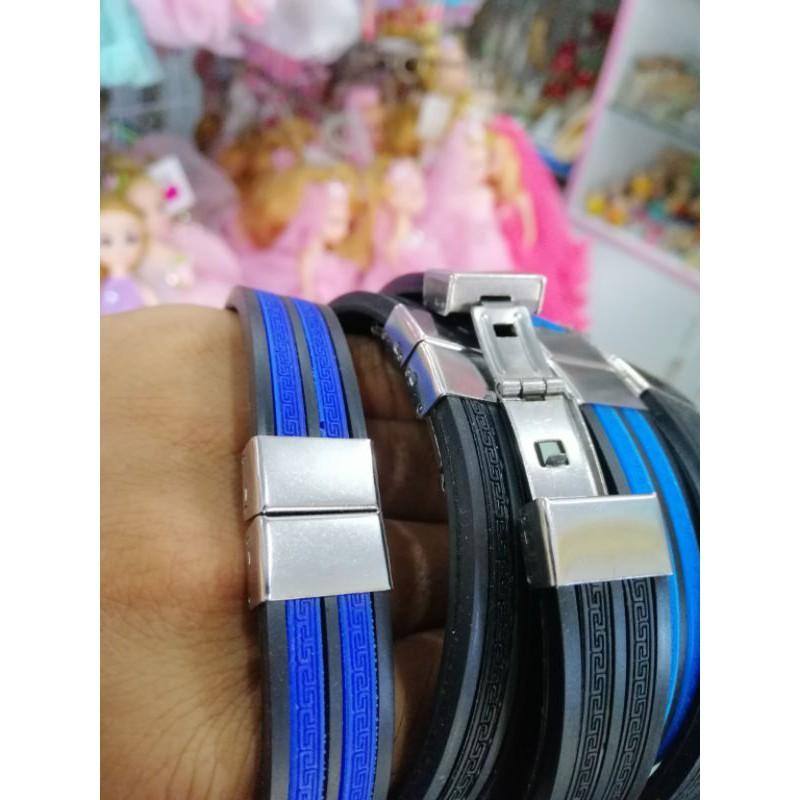 Sản phẩm được kết hợp giữa dây cao su và kim loại inox. Một dây sẽ có 3 hộp inox xỏ vào. 2 hộp bên ngắn để trang trí. Hộp ở giữa dài có cắt khắc logo, biểu tượng đẹp. Dây phù hợp nhiều size...