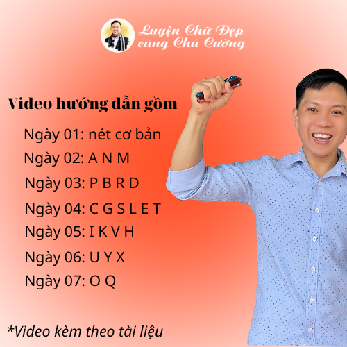 Sản phẩm gồm: + Tập mẫu Hướng Dẫn Bé Viết Bộ Chữ Hoa Sáng Tạo trong 7 ngày và chuỗi video do Chú Cường hướng dẫn. + Sản phẩm KHÔNG BAO GỒM BÚT hay MỰC Sản phẩm phù hợp cho + Các Bạn hoặc các bé muốn học cách viết được 1 bộ Chữ Hoa Sáng Tạo đơn giản + Muốn trao dồi kĩ năng viết chữ hoa sáng tạo + Muốn học dạy lại cho người khác về Chữ Hoa Sáng Tạo Chương trình gồm 7 ngày luyện tập: + Ngày 1: hướng dẫn cầm bút, lia bút, luyện lực tay và 10 nét cơ bản+ Ngày 2: luyện chữ O, Q, U, Y, X+ Ngày 3: luyện chữ I, K, V, H+ Ngày 4: luyện chữ C, G, S+ Ngày 5: luyện chữ L, E, T+ Ngày 6: luyện chữ P, R, B, D+ Ngày 7: luyện chữ A, N, M * Video hướng dẫn không giới hạn thời gian xem Đối với các bé chưa đủ khả năng tự học cần có sự hỗ trợ của phụ huynh. Chú Cường cam kết hướng dẫn hết kiến thức để Bạn có thể viết được nét thanh nét đậm, không cam kết kết quả cho từng học viên. Mọi chi tiết có thể chat ngay với Chú Cường. Cảm ơn rất nhiều.Giá sản phẩm trên Tiki đã bao gồm thuế theo luật hiện hành. Bên cạnh đó, tuỳ vào loại sản phẩm, hình thức và địa chỉ giao hàng mà có thể phát sinh thêm chi phí khác như phí vận chuyển, phụ phí hàng cồng kềnh, thuế nhập khẩu (đối với đơn hàng giao từ nước ngoài có giá trị trên 1 triệu đồng).....
