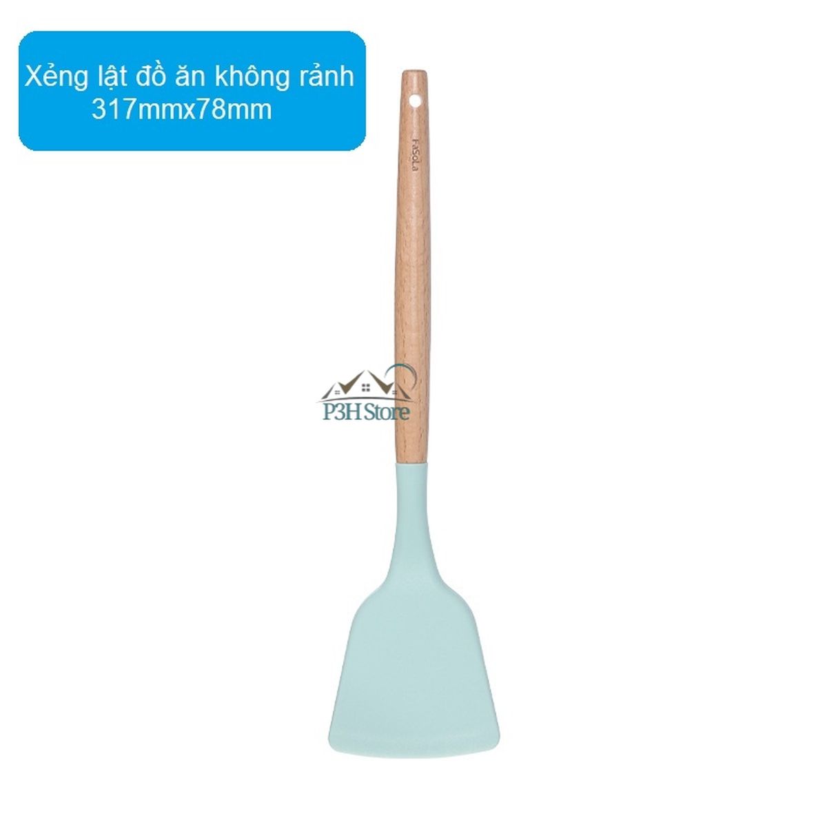 Dụng cụ bếp bằng silicone cán gỗ sồi tự nhiênChất liệu: đầu silicone, cán bằng gỗ sồi tự nhiênMàu sắc: màu xanh ngọcKích thước: 1. Xẻng lật đồ ăn không rảnh 317mmx78mm2. Xẻng lật đồ ăn có rảnh...