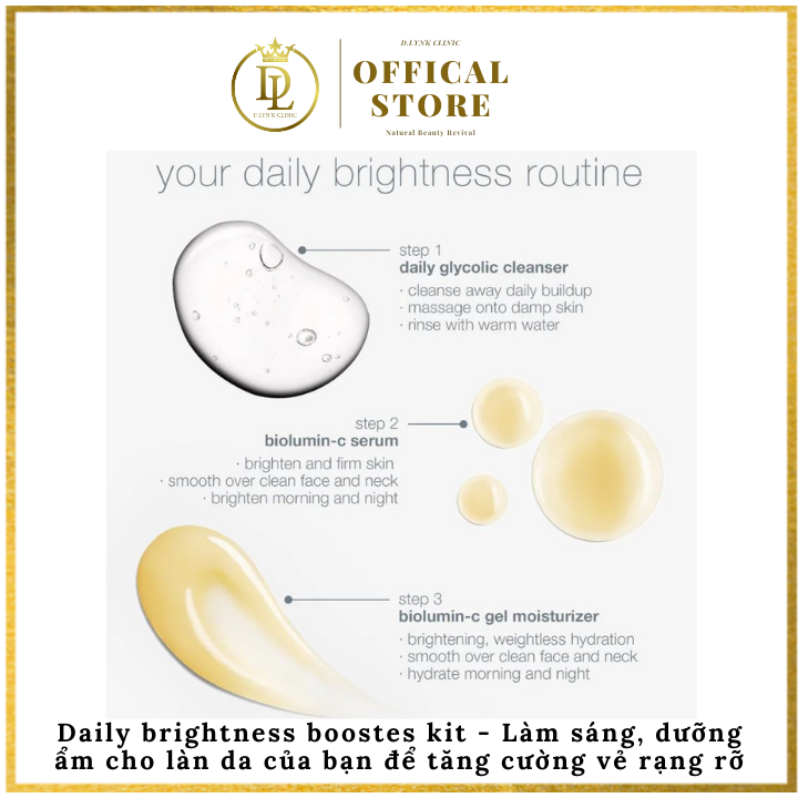 Bộ công cụ này giúp: -Làm sạch và loại bỏ sự tích tụ-Làm sáng và giảm sắc tố không cân bằng-Cung cấp hydrat hóa không trọng lượng Bộ Kít gồm: 1 Daily Glycolic Cleanser - sữa rửa mặt làm sáng, dưỡng1 BioLumin-C Serum - huyết thanh vitamin c làm sáng1 BioLumin-C Gel Moisturizer - dưỡng ẩm vitamin c dưỡng ẩm Mối quan tâm về da: - Dấu hiệu lão hóa da- Da xỉn màu và mờ nhạt- Khô và mất nước1/ Daily Glycolic Cleanser:-Làm sạch và loại bỏ sự tích tụ- Làm sáng và làm đều màu da- Điều kiện và bổ sung da 2/Huyết thanh BioLumin-C:- Làm sáng và giảm sắc tố không cân bằng- Làm săn chắc và giúp giảm sự xuất hiện của nếp nhăn và nếp nhăn- Giúp ngăn ngừa và sửa chữa thiệt hại gốc tự do3/ Kem dưỡng ẩm BioLumin-C Gel:- Cung cấp hydrat hóa không trọng lượng- Giúp làn da rạng rỡ tăng cường- Làm sáng sự xuất hiện của da ngay lập tức và theo thời gianGiá sản phẩm trên Tiki đã bao gồm thuế theo luật hiện hành. Bên cạnh đó, tuỳ vào loại sản phẩm, hình thức và địa chỉ giao hàng mà có thể phát sinh thêm chi phí khác như phí vận chuyển, phụ phí hàng cồng kềnh, thuế nhập khẩu (đối với đơn hàng giao từ nước ngoài có giá trị trên 1 triệu đồng).....