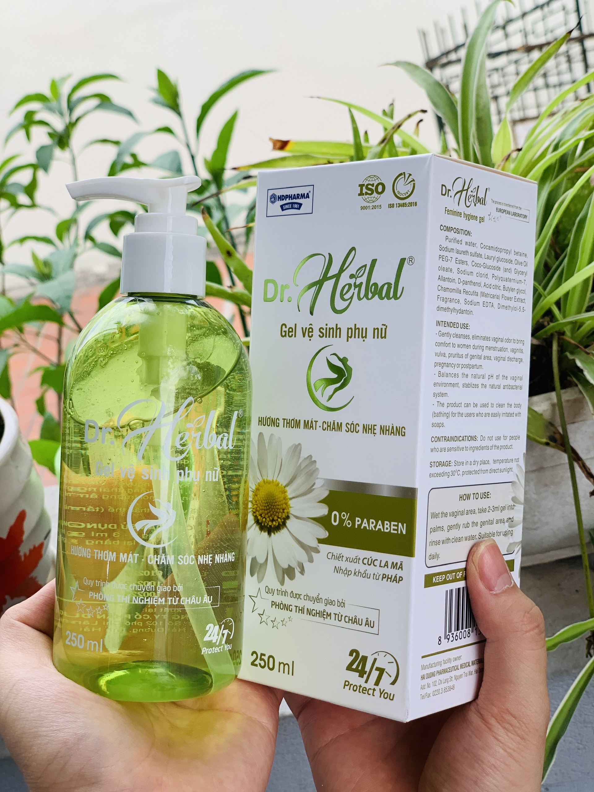 Xin chào! Bạn đang ở gian hàng chính hãng HDPHARMA - 1961. Tất cả các sản phẩm trong shop do HDPHARMA sản xuất và phân phối. Chúng tôi khuyến khích bạn mua hàng tại đây để đảm bảo nguồn hàng chính hãng, uy tín, chất lượng. VỀ SẢN PHẨM:Với những chị em bận rộn, các chuyên gia chăm sóc sức khỏe phụ nữ khuyên dùng các dung dịch vệ sinh được bào chế dưới dạng gel tiện dụng với các thành phần an toàn tuyệt đối từ thảo dược. Trên các diễn đàn, hội nhóm, nhiều chị em mách nhau sử dụng và đánh giá rất cao Gel vệ sinh phụ nữ Dr.Herbal do HDPHARMA – Since 1961 sản xuất vì tính an toàn, hiệu quả, dễ sử dụng và không gây tác dụng phụ. Gel vệ sinh phụ nữ Dr.Herbal - Hương thơm mát, chăm sóc dịu dàng được chị em tin chọn vì nhà sản xuất HDPHARMA cam kết thành phần không có Paraben (chất bảo quản hóa học); được chiết xuất từ Cúc La Mã nhập khẩu từ Pháp có tác dụng làm dịu các tổn thương da, giảm viêm, chống nhiễm khuẩn; quy trình sản xuất được chuyển giao từ phòng thí nghiệm châu Âu, theo chuẩn mực chất lượng cao nhất trên thế giới hiện nay là GMP EU. THÀNH PHẦNPurified water, Cocamidopropyl betaine, Sodium laureth sulfate, Lauryl glucoside, Olive Oil PEG-7 Esters, Coco-Glucoside (and) Glyceryl oleate, Sodium clorid, Polyquaternium-7, Allantoin, D-panthenol, Acid citric, Butylen glycol, Chamomilla Recutita (Matricaria) Flower Extract, Fragrance, Sodium EDTA, Dimethylol-5,5-dimethylhydantoin. CÔNG DỤNG Giúp rửa sạch nhẹ nhàng, khử mùi hôi vùng kín đem lại cảm giác thoải mái cho nữ giới trong thời kỳ kinh nguyệt, viêm, ngứa vùng kín, khí hư nhiều, huyết trắng, thai nghén hoặc sau sinh. Giúp cân bằng pH tự nhiên, ổn định hệ kháng khuẩn tự nhiên. Sản phẩm có thể dùng để vệ sinh thân thể (tắm rửa) đối với các trường hợp dễ bị kích ứng với xà phòng. HƯỚNG DẪN SỬ DỤNG B1: Làm ướt vùng kín. B2: Lấy khoảng 2-3ml gel vào lòng bàn tay, thoa nhẹ nhàng vùng kín. B3: Rửa lại bằng nước sạch. CHỐNG CHỈ ĐỊNH: Không dùng cho người mẫn cảm với các thành phần có trong sản phẩm. Để xa tầm tay trẻ em.Giá sản phẩm trên Tiki đã bao gồm thuế theo luật hiện hành. Bên cạnh đó, tuỳ vào loại sản phẩm, hình thức và địa chỉ giao hàng mà có thể phát sinh thêm chi phí khác như phí vận chuyển, phụ phí hàng cồng kềnh, thuế nhập khẩu (đối với đơn hàng giao từ nước ngoài có giá trị trên 1 triệu đồng).....