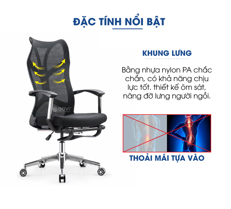 Ghế công thái học GOVI có Ưu điểm vượt trội:Bảo vệ sức khỏe người dùng, hạn chế mắc các bệnh văn phòng.Ghế xoay lưng lưới phù hợp cho thời tiết mùa hè nóng bức, tạo cảm giác thoải mái cho người ngồi...