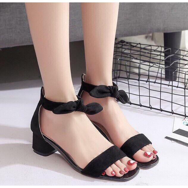 Giày sandal cao gót vuông 5cm quai ngang cổ nơ vải to