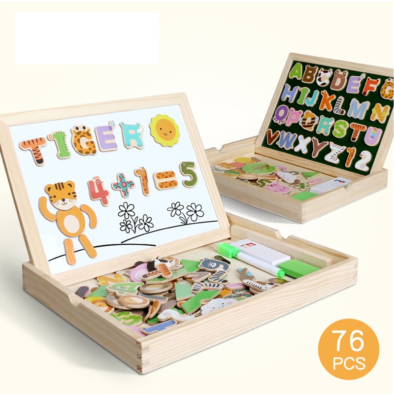 Sản phẩm bao gồm: hộp đựng, bảng từ tính với 2 mặt khác nhau xanh và trắng, một cây bút viết, một hộp phấn, một khăn lau và các mảnh ghép khác nhau: chữ, số, hình con vật, cây…Với các hình có sẵn bé ...