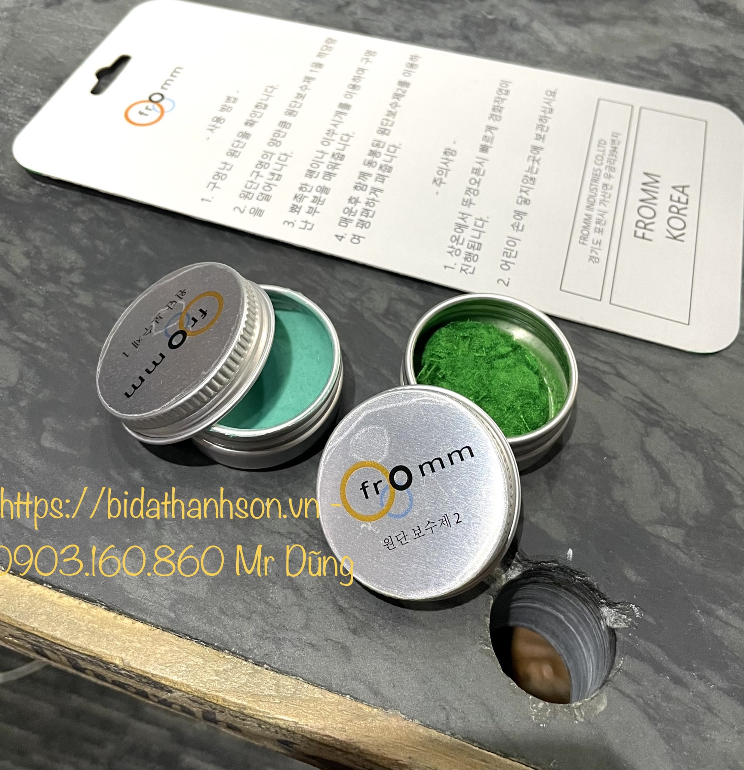 [ Keo Vá Vải Bàn Bida ] – FROMM gồm: – 1 Lọ keo kết dính – 1 Lọ vải vụn Màu Sắc: Xanh Dương – Xanh Dương Nhạt – Xanh Lá Giúp phủ phẳng bề mặt vải bị rách do khách vô tình làm thủng. – Giúp Bi chạy êm ...