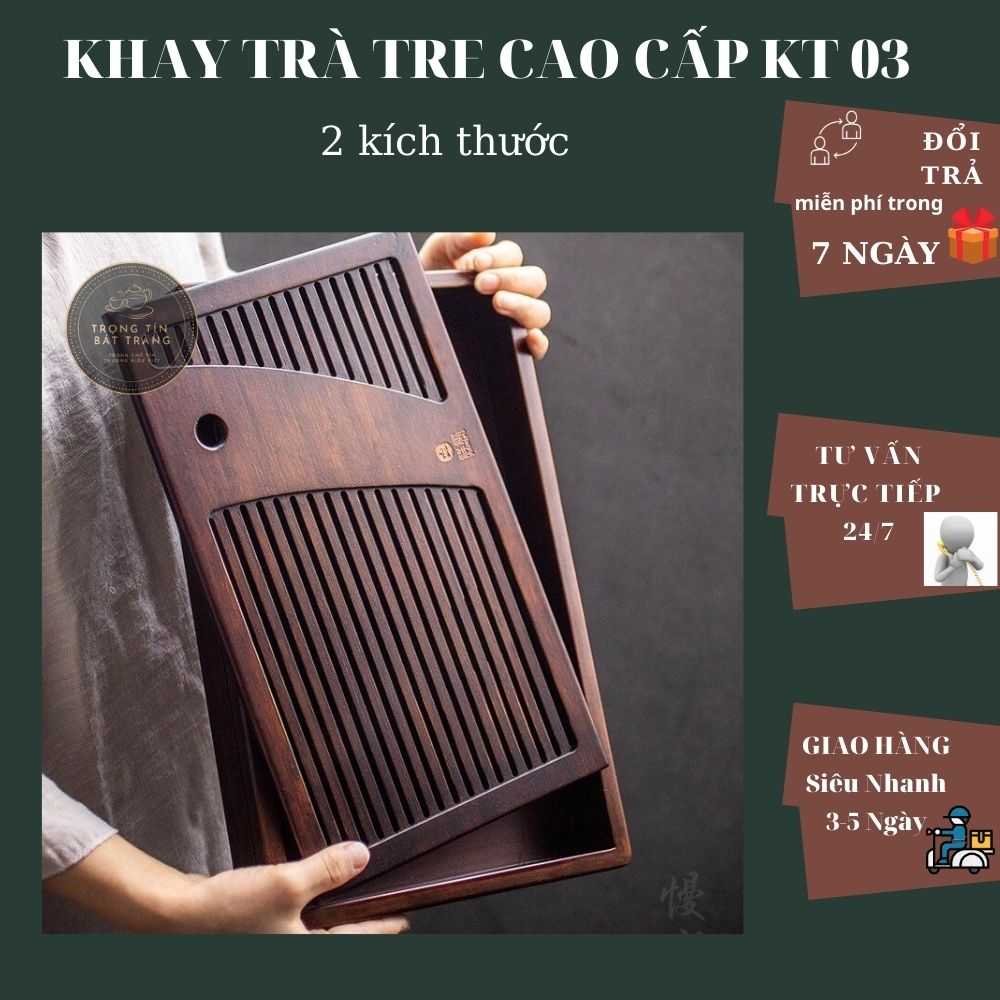 Khay Trà Tre Cao Cấp Chữ Nhật KT 03.1 THÔNG TIN SẢN PHẨM: + Kích Thước 35*23*5,5 + Màu sắc: Nâu mun + Kiểu dáng: Hình Chữ Nhật + Hoạ tiết: Lượn + Chất liệu: Tre + Xuất xứ: NK + Khay chứa nước: Có 5 CAM KẾT - Hàng thật như hình. - Hàng bền, đẹp. - Không giống hoàn hàng! - Hỗ trợ khách nhiệt tình trước, đang và sau khi mua hàng! - Chế Độ Đổi Trả: + Đổi trả 1:1 nếu sai sản phẩm + Đổi trả 1:1 nếu sứt mẻ, biến dạng, cong vênh - Giao Hàng Thần Tốc: + Nội Thành <3 ngày + Ngoài Thành 3-5 ngày *** Cảm Ơn Quý Khách Đã Tin Dùng Sản Phẩm Của Chúng Tôi ***Giá sản phẩm trên Tiki đã bao gồm thuế theo luật hiện hành. Bên cạnh đó, tuỳ vào loại sản phẩm, hình thức và địa chỉ giao hàng mà có thể phát sinh thêm chi phí khác như phí vận chuyển, phụ phí hàng cồng kềnh, thuế nhập khẩu (đối với đơn hàng giao từ nước ngoài có giá trị trên 1 triệu đồng).....