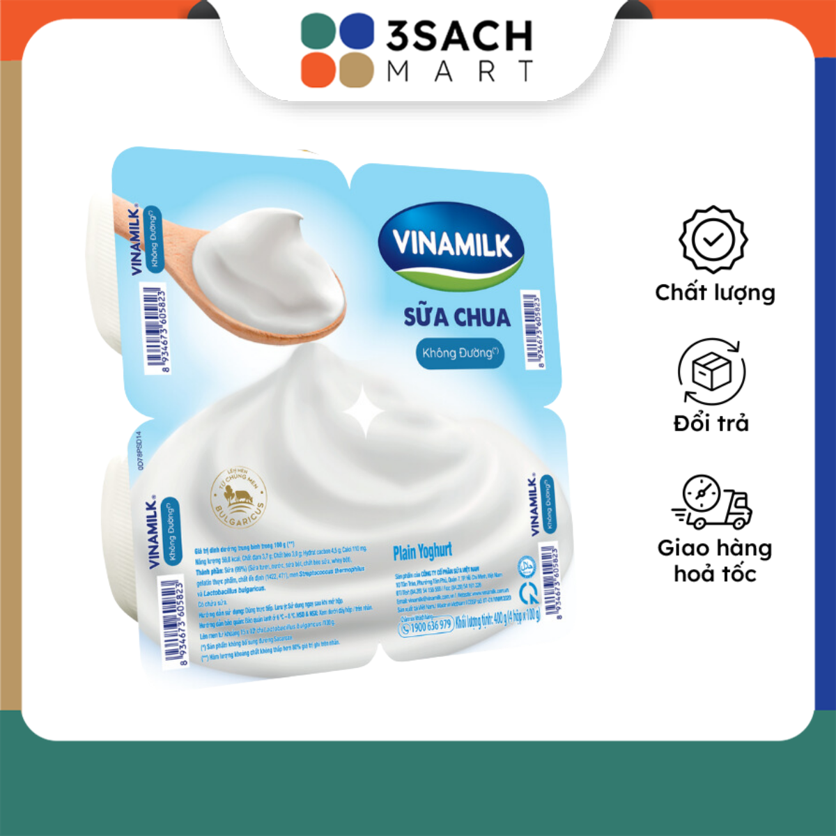 Với sản phẩm tươi sống, trọng lượng thực tế có thể chênh lệch khoảng 10%. Sữa chua Vinamilk chứa nhiều canxi, vitamin, khoáng chất ở dạng dễ hấp thu, kích thích vị giác, tăng cường sức khỏe hệ tiêu hóa, miễn dịch. Lốc 4 hộp sữa chua không đường Vinamilk 100g là loại sữa chua có hương vị thơm ngon tinh khiết và giàu dưỡng chất, thích hợp cho mọi người. Đặc tính:Sữa chua chứa nhiều lợi khuẩn tốt cho tiêu hoá và các khoáng chất như kali, canxi, magiê, kẽm, selen, vitamin giúp tăng cường hệ miễn dịch. Nhắc đến thương hiệu sữa tươi ha các sản phẩm từ sữa quốc dân tại Việt Nam thì không thể nào bỏ qua được Vinamilk, thương hiệu với hàng chục năm kinh nghiệm trong nghề và nỗ lực phát triển không ngừng nghỉ, hãng cho ra mắt các sản phẩm chất lượng như: sữa tươi, sữa chua, phô mai, váng sữa, được rất nhiều khách hàng quan tâm và tin bởi hương vị thơm ngon, lại chứa đầy đủ các chất dinh dưỡng tốt cho sức khỏe, hơn hết là giá thành của sản phẩm hợp lý, phù hợp với nhiều đối tượng khách hàng.Vinamilk lọt vào top 40 doanh nghiệp có doanh thu các sản phẩm từ sữa cao nhất thế giới và gặt hái được những thành công ấn tượng trên thị trường quốc tế. Thành phần dinh dưỡng trong sản phẩmLốc 4 hộp sữa chua Vinamilk không đường 100g là sản phẩm khá quen thuộc với hầu hết các thực khách, làm từ nguyên liệu tự nhiên như: Sữa, gelatin thực phẩm, chất ổn định (1422, 471, 440), men Streptococcus thermophilus và Lactobacillus bulgaricus an toàn cho sức khỏe. Đảm bảo cung cấp được các giá trị dinh dưỡng thiết yếu như: Năng lượng, chất đạm, chất béo, carbohydrate, calci. 100g sữa chua Vinamilk không đường sẽ chứa 59.8 calo, lượng calo vừa đủ cho cơ thể, không sợ béo khi dùng sản phẩm nhé! Tác dụng của sản phẩm với sức khỏeLốc 4 hộp sữa chua Vinamilk không đường 100g sản phẩm sữa chua chứa nhiều lợi khuẩn tốt cho tiêu hoá và các khoáng chất như kali, canxi, magiê, kẽm, selen, vitamin giúp tăng cường hệ miễn dịch.Bên cạnh đó sản phẩm còn được sử dụng như là nguyên liệu chăm sóc da, tóc được hội chị em ưa chuộng. Hướng dẫn sử dụng và cách bảo quảnHướng dẫn sử dụng: Dùng ngay sau khi mở bao bì hoặc có thể kết hợp với các nguyên liệu khác cho các món ăn thơm ngon khó cưỡng.Cách bảo quản: Bảo quản ở nhiệt độ 6 - 8 độ C hoặc bạn cho vào ngăn mát tủ lạnh để bảo quản cũng được nhé! Các món ăn, thức uống ngon từ sản phẩmLốc 4 hộp sữa chua Vinamilk không đường 100g sản phẩm ăn liền trực tiếp hay có thể kết hợp cho các món ngon khó cưỡng như: trái cây tô, salad, sữa chua đá xay, bánh sữa chua, rau câu sữa chua, các loại sinh tố,Giá sản phẩm trên Tiki đã bao gồm thuế theo luật hiện hành. Bên cạnh đó, tuỳ vào loại sản phẩm, hình thức và địa chỉ giao hàng mà có thể phát sinh thêm chi phí khác như phí vận chuyển, phụ phí hàng cồng kềnh, thuế nhập khẩu (đối với đơn hàng giao từ nước ngoài có giá trị trên 1 triệu đồng).....