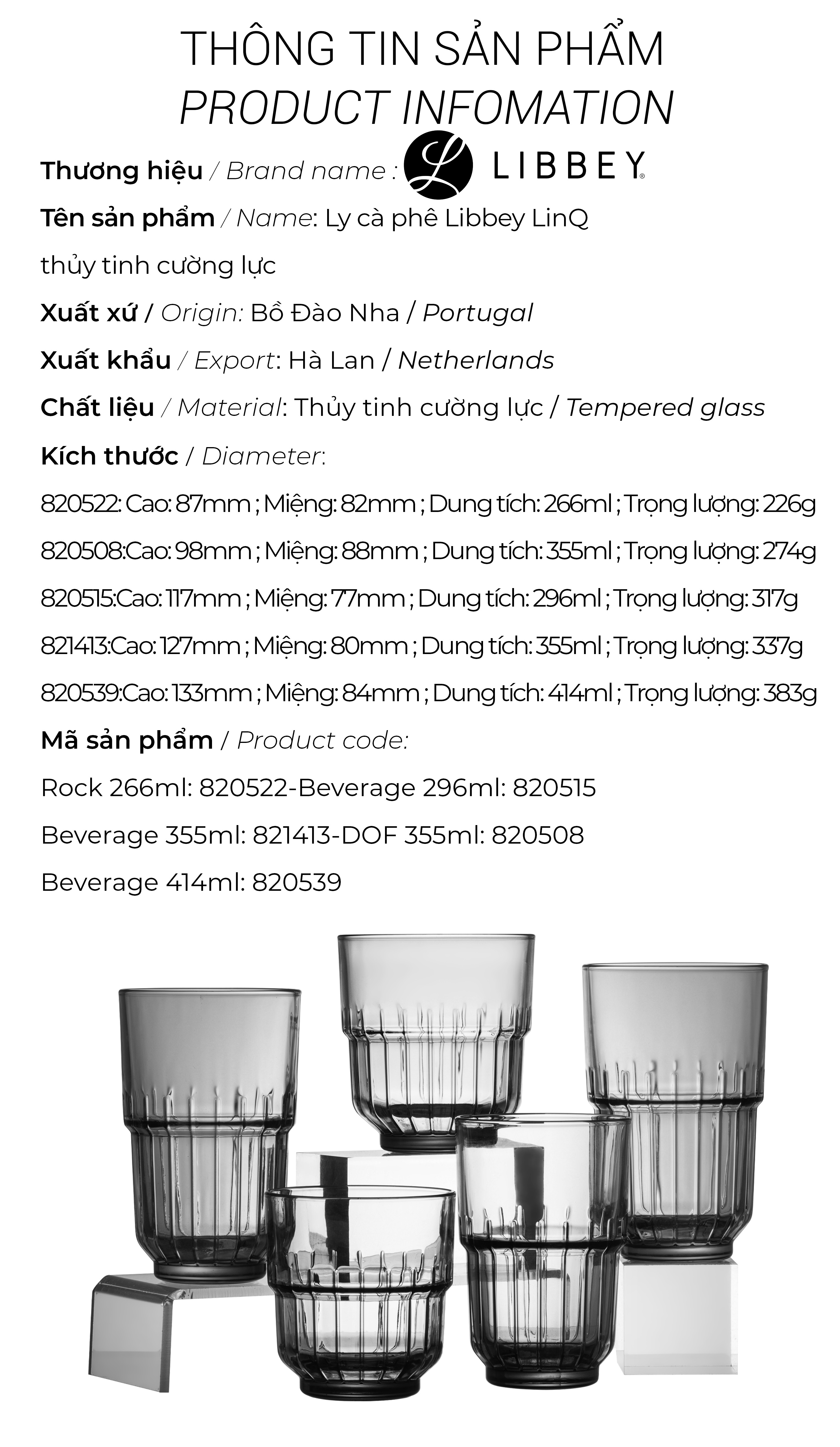 Ly cà phê thủy tinh cường lực Libbey LinQ Libbey là một trong 3 nhãn hàng đồ dùng thủy tinh lớn nhất thế giới, ra đời năm 1818 với trụ sở chính tại Ohio nước Mỹ. Libbey hiện có 6 nhà máy ở 5 quốc gia: Mỹ, Mexico, Bồ Đào Nha, Hà Lan và Trung Quốc. Nhờ có hai đội ngũ thiết kế ở châu Âu và Mỹ, các mãu mã của Libbey thể hiện rõ đặc trưng của hai khu vực: hoặc đơn giản và hữu dụng, hoặc thanh mảnh và sang trọng. Không khó khăn để nhận biết độ lớn của Libbey thông qua sự đa dạng về mẫu mã, về dung tích trong cùng một thiết kế. Libbey còn được biết đến về độ bền nổi trội, đóng góp đáng kể về mặt hiệu quả kinh tế cho các khách hàng khu vực khách sạn, nhà hàng, quán cà phê. Tiết kiệm không gian với tính năng xếp chồng độc đáo, khả năng cường lực với công nghệ DuraTuff tối ưu, ly màu xám khói tinh xảo tô vẽ cho bất kỳ loại đồ uống nào. Đó chính là dòng LinQ tuyệt vời của Libbey. Xuất xứ: Bồ Đào Nha Nước xuất khẩu: Hà LanGiá sản phẩm trên Tiki đã bao gồm thuế theo luật hiện hành. Bên cạnh đó, tuỳ vào loại sản phẩm, hình thức và địa chỉ giao hàng mà có thể phát sinh thêm chi phí khác như phí vận chuyển, phụ phí hàng cồng kềnh, thuế nhập khẩu (đối với đơn hàng giao từ nước ngoài có giá trị trên 1 triệu đồng).....