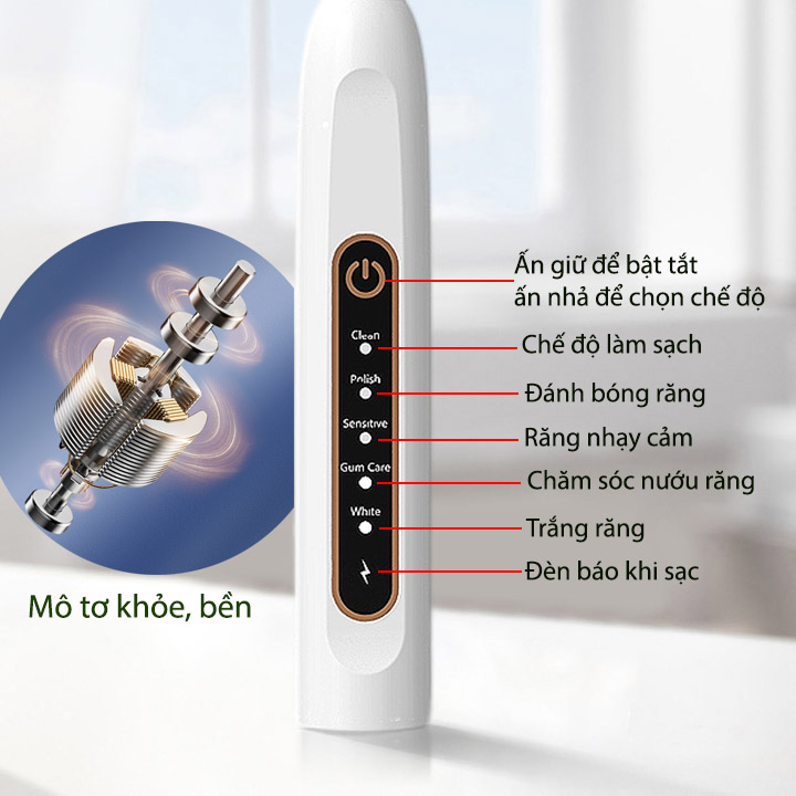 Máy đánh răng cầm tay dùng pin sạc E7 với 5 chế độ tùy chọn Máy đánh răng cầm tay dùng pin sạc được thiết kế nhỏ gọn, tiện dụng, dùng đánh răng cho người lớn, trẻ ở nhà hoặc mang đi du lịch đều được Máy trang bị pin sạc gắn sẵn bên trong rất tiện dụng, vật liệu nhựa ABS bền, mô tơ khỏe chạy êm với tần số dao động lên tới 1500 lần/phút. Đầu bàn chải dễ dàng tháo lắp và thay thế dễ dàng Thông số kỹ thuật Model: E7 Vật liệu: Nhựa ABS Công suất: 5W Tần số dao động: 1500 lần/phút Áp lực: 40-105 PSI Moto: Lõi dây đồng rất bền, khỏe Cổng sạc: mUSB, Nguồn sạc: Từ cổng USB 5V (không bao gồm bộ nguồn) Kích thước: D2.5cm, dài tổng 21cm Trọng lượng: 90g Chống nước: Có với IP64 Sản phẩm gồm: Thân máy, 1 đầu bàn chải, cáp sạc (không bao gồm bộ sạc adapter) Ứng dụng: Dùng đánh răng cho người lớn, trẻ ở nhà hoặc mang đi du lịch đều đượcGiá sản phẩm trên Tiki đã bao gồm thuế theo luật hiện hành. Bên cạnh đó, tuỳ vào loại sản phẩm, hình thức và địa chỉ giao hàng mà có thể phát sinh thêm chi phí khác như phí vận chuyển, phụ phí hàng cồng kềnh, thuế nhập khẩu (đối với đơn hàng giao từ nước ngoài có giá trị trên 1 triệu đồng).....