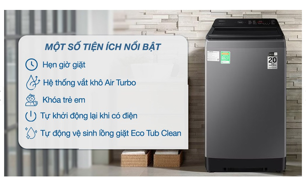 Máy giặt Samsung Inverter 9.5 kg WA95CG4545BDSV có khả năng đánh bay vết bẩn cứng đầu hiệu quả nhờ công nghệ bong bóng siêu mịn Eco Bubble, công nghệ Digital Inverter tiết kiệm điện năng, vận hành êm ái, giặt sạch siêu tốc 29 phút đảm bảo hiệu quả sạch sâu. *Hình ảnh chỉ mang tính chất minh họa sản phẩm Thiết kế - Kiểu dáng: máy giặt cửa trên - lồng đứng dạng hình khối chữ nhật đứng thiết kế tối giản, hiện đại, tông màu đen - xám trang nhã, tô điểm cho không gian sống của bạn sang trọng, đẳng cấp hơn. - Bảng điều khiển song ngữ Anh - Việt, có màn hình hiển thị thân thiện, thiết kế nghiêng ở mặt sau của máy giặt, tránh được tình trạng nước tràn vào bề mặt màn hình điều khiển và cho người dùng thao tác thoải mái, dễ dàng hơn. - Lồng giặt bằng thép không rỉ hạn chế rỉ sét, thiết kế các lỗ thoát nước nhỏ giảm khả năng làm tưa sờn mặt vải, bảo vệ quần áo, đảm bảo hiệu quả giặt giũ tối ưu. - Nắp máy chất liệu kính chịu lực dày bền, chịu lực tốt, được làm trong suốt cho bạn dễ quan sát bên trong máy ngay cả khi không mở nắp máy giặt Samsung ra. *Hình ảnh chỉ mang tính chất minh họa sản phẩm Khối lượng giặt và chương trình giặt - Khối lượng giặt đạt 9.5 kg, phù hợp sử dụng cho gia đình có từ 5 - 7 người hoặc gia đình ít thành viên hơn nhưng có trẻ nhỏ, nhu cầu giặt cao hơn thông thường. - Thiết lập 10 chương trình giặt như giặt siêu sạch, giặt nhanh, giặt thường, giặt ga giường, tiết kiệm nước, đồ trẻ em, đồ Jeans, vệ sinh lồng giặt, (xem chi tiết tại bảng thông số kỹ thuật). Có chương trình giặt nhanh giúp bạn dễ dàng giặt sạch những trang phục mình cần gấp trong thời gian ngắn mà không cần chờ đợi quá lâu. *Hình ảnh chỉ mang tính chất minh họa sản phẩm Công nghệ giặt đặc biệt - Công nghệ giặt bong bóng siêu mịn Eco Bubble: kích hoạt chất giặt tẩy cùng với sự kết hợp giữa khí và nước sẽ tạo thành những bong bóng siêu mịn đi sâu vào sợi vải nhanh chóng, loại bỏ các vết bẩn bám trên quần áo hiệu quả, hạn chế làm hư hỏng, bảo vệ màu, chất liệu tốt hơn. *Hình ảnh chỉ mang tính chất minh họa sản phẩm - Chế độ giặt Super Speed: dưới lực nước mạnh mẽ từ vòi phun nước siêu tốc, các bong bóng xà phòng siêu mịn sẽ được tăng tốc mức độ thẩm thấu sâu vào bên trong sợi vải, nhờ đó góp phần đánh bay vết bẩn cứng đầu hiệu quả và tiết kiệm thời gian giặt đến 40% cho nhiều chế độ giặt được thiết lập trên máy. *Hình ảnh chỉ mang tính chất minh họa sản phẩm - Bộ lọc xơ vải Magic Filter: giúp lọc sạch lông xơ, bụi bẩn, xơ vải, hạn chế nguy cơ gây tắc đường ống thoát nước, giữ cho trang phục bạn tươm tất, sạch đẹp. - Công nghệ Intensive Wash: máy giặt hỗ trợ công nghệ này có khả năng làm tan bột giặt nhanh chóng để nước thẩm thấu vào vải sâu, giải quyết những vết bẩn cứng đầu dễ dàng. Động cơ - Công nghệ tiết kiệm điện - Samsung WA95CG4545BDSV tích hợp động cơ truyền động trực tiếp, công nghệ Digital Inverter giảm thiểu ma sát khi hoạt động, đảm bảo thiết bị vận hành êm ái, tiết kiệm điện năng đồng thời sử dụng bền bỉ trong suốt quá trình sử dụng. - Nhãn năng lượng: 5 sao. *Hình ảnh chỉ mang tính chất minh họa sản phẩm Tiện ích - Tự động vệ sinh lồng giặt: thiết bị tự động loại bỏ các chất bẩn bám vào lồng giặt giữ cho bộ phận này luôn sạch sẽ, tăng chất lượng nước giặt, giảm bớt thời gian vệ sinh cho chị em nội trợ. *Hình ảnh chỉ mang tính chất minh họa sản phẩm Tóm lại, máy giặt Samsung Inverter 9.5 kg WA95CG4545BDSV với 10 chương trình giặt đa dạng, công nghệ giặt bong bóng siêu mịn Eco Bubble, Intensive Wash, Super Speed, Digital Inverter, sẽ giúp công việc giặt giũ của bạn trở nên nhanh chóng, thuận lợi, khối lượng giặt đến 9.5 kg, lựa chọn đúng đắn cho gia đình có từ 5 đến 7 thành viên.Giá sản phẩm trên Tiki đã bao gồm thuế theo luật hiện hành. Bên cạnh đó, tuỳ vào loại sản phẩm, hình thức và địa chỉ giao hàng mà có thể phát sinh thêm chi phí khác như phí vận chuyển, phụ phí hàng cồng kềnh, thuế nhập khẩu (đối với đơn hàng giao từ nước ngoài có giá trị trên 1 triệu đồng).....