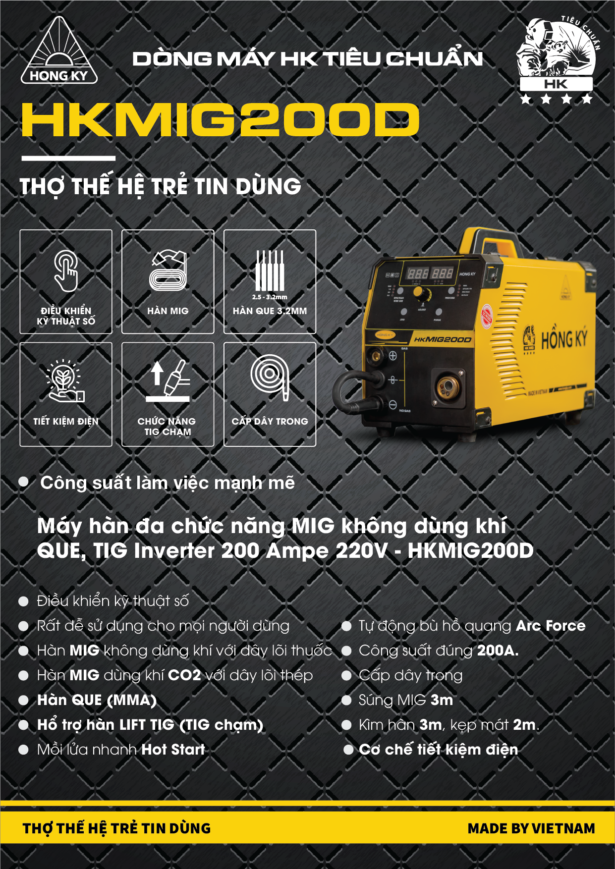 Máy hàn MIG không dùng khí Hồng Ký 200 Ampe 220V HKMIG200D