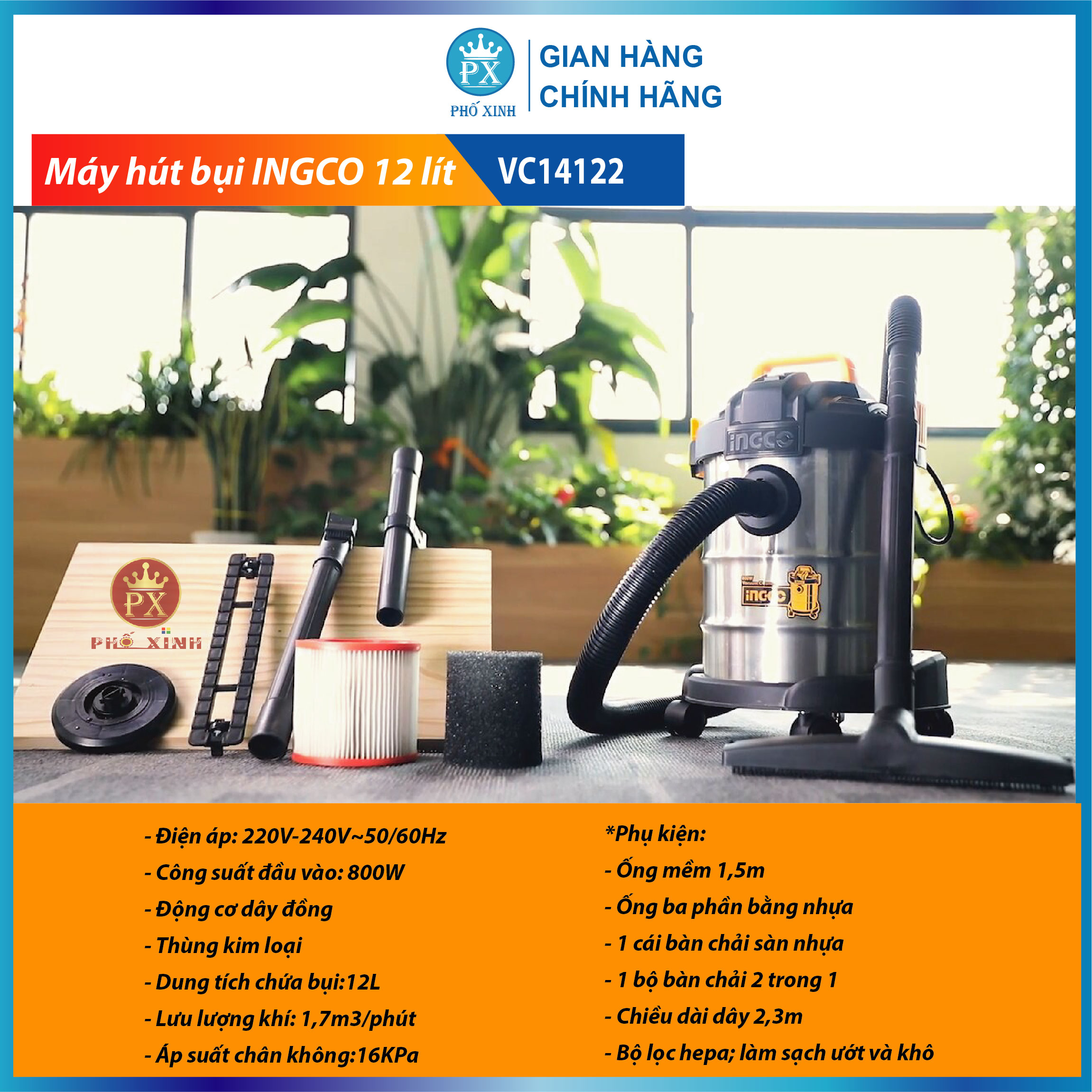 Máy hút bụi INGCO VC14122 máy hút bụi mô tơ đồng 800W, Kèm Ống ruột gà 1.5m, 3 đoạn ống nối, Cục lọc HEPA hút bụi THÔNG SỐ KỸ THUẬT MÁY HÚT BỤI INGCO VC14122 - Mã sản phẩm: VC14122 - Nhà sản xuất: Ingco - Xuất xứ: PRC- Điện thế: 220V-240V~50/60Hz. - Công suất: 800W - Mô tơ dây đồng. - Bình chứa kim loại - Dung tích:12L. - Lưu lượng khí:1.7m3/phút - Áp suất hút:16KPa. - Ống ruột gà 1.5m3 đoạn ống nối, 1 bàn chải nhựa, 1 bộ - Bàn chải 2 trong 1 - Dây nguồn dài 2.3m, - Cục lọc HEPA - Vệ sinh ướt và khô. Đóng gói thùng giấy - Bảo hành 6 thángGiá sản phẩm trên Tiki đã bao gồm thuế theo luật hiện hành. Bên cạnh đó, tuỳ vào loại sản phẩm, hình thức và địa chỉ giao hàng mà có thể phát sinh thêm chi phí khác như phí vận chuyển, phụ phí hàng cồng kềnh, thuế nhập khẩu (đối với đơn hàng giao từ nước ngoài có giá trị trên 1 triệu đồng).....