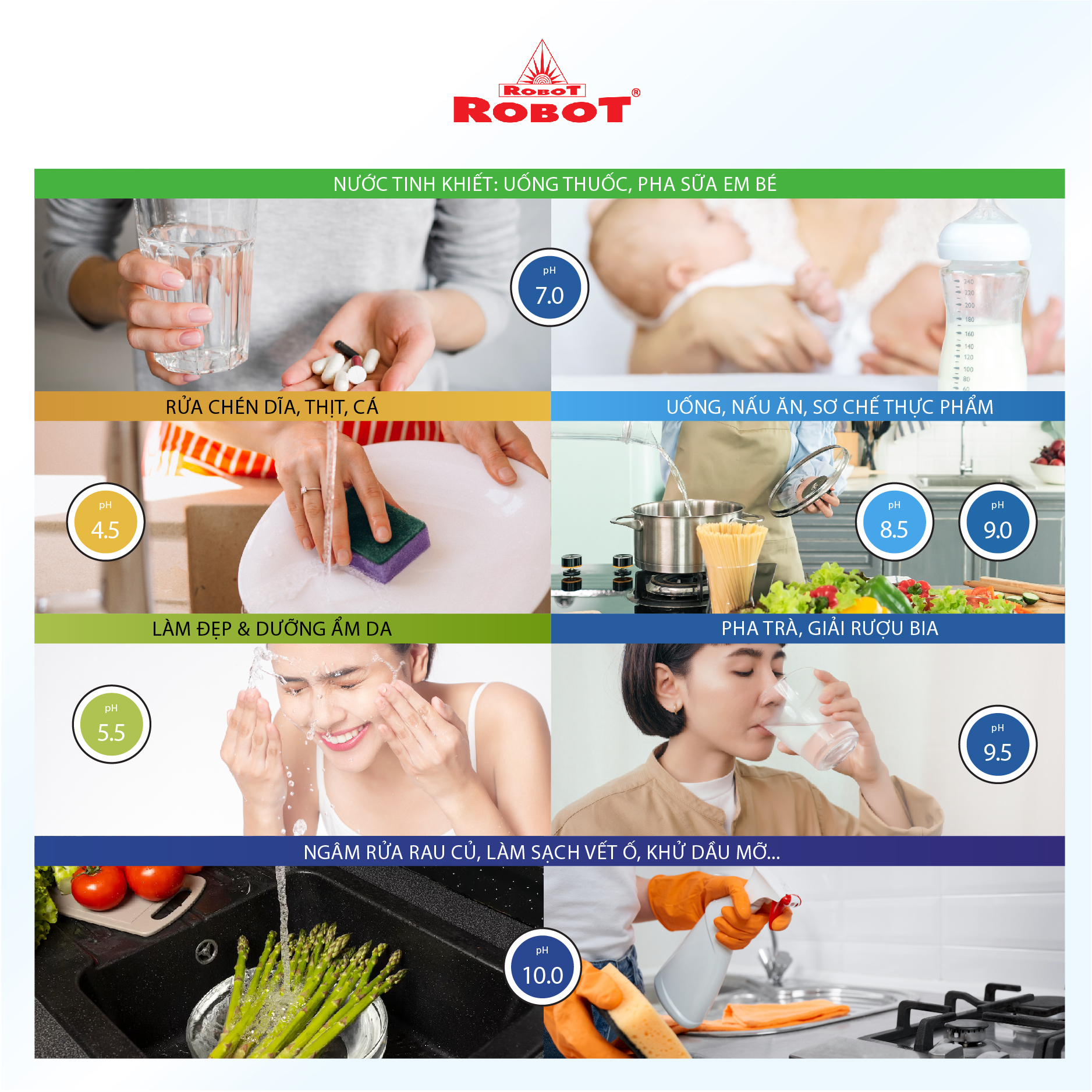 Máy lọc nước điện giải iON kiềm ROBOT ionPrince 37 ️Máy lọc nước điện giải iON kiềm ROBOT ionPrince 37 là sản phẩm được sản xuất với công nghệ tiên tiến, cao cấp trang bị đến 3 tấm điện cực lớn nhất, có khả năng tạo ra đến 7 loại nước đa chức năng, với 4 mức nước iON kiềm (pH 8.5 – 10.0), nước lọc trung tính (pH 7.0) & 2 mức nước iON axit (pH 4.5 - 5.5). Chất lượng nước đạt chỉ số tối ưu, nồng độ Hydro hoạt tính lên đến ~350 -> 600 ppb, chống oxy hóa (ORP) lên đến ~ -300 -> -450 mV, đáp ứng mọi nhu cầu sử dụng trong cuộc sống. ️Máy lọc nước điện giải iON kiềm ROBOT ionPrince được thiết kế kiểu dáng hiện đại, thiết kế chinh phục mọi không gian. Đặc biệt, bộ sưu tập 5 sắc màu pastel hiện đại đáp ứng mọi sở thích và phong cách nội thất, chắc chắn sản phẩm sẽ là điểm nhấn đặc sắc trong ngôi nhà của bạn. +️+ Máy lọc nước điện giải iON kiềm ROBOT ionPrince 37,tạo 7 loại nước bổ ích, pH từ 4.5 --> 10.0 - Đáp ứng mọi nhu cầu trong cuộc sống️- Tăng cường sức đề kháng, hỗ trợ phòng ngừa bệnh mạn tính️- Cải thiện hệ tiêu hóa, giảm các triệu chứng của bệnh về dạ dày-️ Bù khoáng và chất điện giải cho người chơi thể thao, vận động mạnh️-Trung hòa axit trong cơ thể, đào thải độc tố, giải rượu bia-️ Sơ chế thực phẩm, làm sạch rau, củ, quả…️- Nước làm đẹp, pH 5.5 tương tự như toner giúp làm mịn da, ngăn ngừa lão hóa️- Dùng gội đầu giúp tóc bóng mượt, chắc khỏe️- Khử khuẩn, vệ sinh thực phẩm, đồ vật và các bề mặt ️ Kiểu dáng hiện đại - Thiết kế chinh phục mọi không gian+ Kiểu dáng để bàn, hoặc treo tường, nhỏ gọn+ Sử dụng linh hoạt cho mọi không gian+ Vòi nước điện giải xoay 360°+ Hệ thống điều khiển cảm ứng trên mặt phủ kính với màn hình LCD tinh tế + Với mong muốn nhiều gia đình Việt có thể sử dụng nước điện giải iON kiềm với chi phí hợp lý để bảo vệ sức khỏe, sắc đẹp & nâng cao chất lượng cuộc sống, ROBOT mang đến sản phẩm “Chất lượng Quốc tế - Giá thành Việt Nam”, phù hợp với mức sống của nhiều người. Tiết kiệm cho người tiêu dùng đến hơn một nửa chí phí so với máy nhập khẩu chỉ từ 30 – 50%, nhưng sở hữu nhiều ưu điểm, tính năng vượt trội, chất lượng cao. + Chế độ bảo hành chính hãng, tận nơi, vật tư và linh kiện, lõi lọc luôn có sẵn hạn chế tối đa chi phí sửa chữa, bảo trì. +++ VĐV Cầu Lông Nguyễn Tiến Minh – tay vợt từng đứng Top 5 Thế Giới chia sẻ: Sau một thời gian sử dụng Máy lọc nước điện giải iON kiềm Minh thấy cải thiện sức khỏe rất nhiều và tốc độ hồi phục sau tập luyện, thi đấu cũng nhanh hơn so với trước đây. Bây giờ mỗi khi đi tập, hay khi đi thi đấu, Minh đều mang theo nước iON kiềm để uống. ROBOT là một thương hiệu Việt Nam uy tín nên Minh hoàn toàn tin tưởng và lựa chọn Máy lọc nước điện giải iON kiềm ROBOT. ️Thông Tin Thương HiệuCÔNG TY CỔ PHẦN ĐẦU TƯ ROBOT- Sau 30 năm hình thành và phát triển, ROBOT giữ vững vị trí là thương hiệu hàng đầu trong ngành sản xuất thiết bị điện tại Việt Nam, đã xuất khẩu trên 20 quốc gia với các dòng sản phẩm : ỔN ÁP, THIẾT BỊ ĐIỆN, DÂY CÁP ĐIỆN luôn đảm bảo tiêu chí AN TOÀN ĐIỆN- Từ nền tảng vững chắc, ROBOT đã chuyển mình mạnh mẽ, mở rộng sản xuất, cung ứng thêm các sản phẩm mới : Máy làm mát, máy lọc không khí & Máy lọc nước,để mang đến cho người tiêu dùng những sản phẩm không chỉAN TOÀN ĐIỆN mà còn AN TOÀN CHO SỨC KHỎE #maylocnuocdiengiai #ionprince #maylocnuoc #robot #maylocnuoc #ionkiem #diengiaiGiá sản phẩm trên Tiki đã bao gồm thuế theo luật hiện hành. Bên cạnh đó, tuỳ vào loại sản phẩm, hình thức và địa chỉ giao hàng mà có thể phát sinh thêm chi phí khác như phí vận chuyển, phụ phí hàng cồng kềnh, thuế nhập khẩu (đối với đơn hàng giao từ nước ngoài có giá trị trên 1 triệu đồng).....