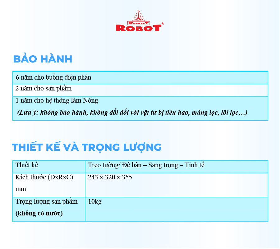 Máy Lọc Nước Điện Giải Ion Kiềm ROBOT IonSmart 1112 Nóng Thông Minh - Tạo 12 Loại Nước ️Máy lọc nước điện giải iON kiềm ROBOT ionSmart 1112 là sản phẩm được sản xuất với công nghệ tiên tiến, cao cấp trang bị đến 11 tấm điện cực lớn nhất, có khả năng tạo ra đến 12 loại nước đa chức năng, với 6 mức nước iON kiềm (pH 8.5 - 11.0), nước lọc trung tính (pH 7.0) Nguội – Nóng & 5 mức nước iON axit (pH 3.5 - 5.5). Chất lượng nước đạt chỉ số tối ưu, nồng độ Hydro hoạt tính lên đến ~1500 -> 1800 ppb, chống oxy hóa (ORP) lên đến ~ -850 -> -1000 mV, đáp ứng mọi nhu cầu sử dụng trong cuộc sống. ️ Máy lọc nước điện giải iON kiềm Nóng ROBOT ionSmart được thiết kế kiểu dáng hiện đại, thiết kế chinh phục mọi không gian. Đặc biệt, bộ sưu tập 5 sắc màu pastel hiện đại đáp ứng mọi sở thích và phong cách nội thất, chắc chắn sản phẩm sẽ là điểm nhấn đặc sắc trong ngôi nhà của bạn. ️ Máy lọc nước điện giải iON kiềm Nóng ROBOT ionSmart 1112,tạo 12 loại nước bổ ích, pH 3.5 --> 11.0 - Đáp ứng mọi nhu cầu trong cuộc sống+ Tăng cường sức đề kháng, hỗ trợ phòng ngừa bệnh mạn tính+ Cải thiện hệ tiêu hóa, giảm các triệu chứng của bệnh về dạ dày+ Bù khoáng và chất điện giải cho người chơi thể thao, vận động mạnh+ Trung hòa axit trong cơ thể, đào thải độc tố, giải rượu bia+ Sơ chế thực phẩm, làm sạch rau, củ, quả…+ Nước làm đẹp, pH 5.5 tương tự như toner giúp làm mịn da, ngăn ngừa lão hóa+ Dùng gội đầu giúp tóc bóng mượt, chắc khỏe+ Khử khuẩn, vệ sinh thực phẩm, đồ vật và các bề mặt ️ Kiểu dáng hiện đại - Thiết kế chinh phục mọi không gian+ Kiểu dáng để bàn, hoặc treo tường, nhỏ gọn+ Sử dụng linh hoạt cho mọi không gian+ Vòi nước điện giải xoay 360°+ Hệ thống điều khiển cảm ứng trên mặt phủ kính với màn hình LCD tinh tế ️ Với mong muốn nhiều gia đình Việt có thể sử dụng nước điện giải iON kiềm với chi phí hợp lý để bảo vệ sức khỏe, sắc đẹp & nâng cao chất lượng cuộc sống, ROBOT mang đến sản phẩm “Chất lượng Quốc tế - Giá thành Việt Nam”, phù hợp với mức sống của nhiều người. Tiết kiệm cho người tiêu dùng đến hơn một nửa chí phí so với máy nhập khẩu chỉ từ 30 – 50%, nhưng sở hữu nhiều ưu điểm, tính năng vượt trội, chất lượng cao. ️ Chế độ bảo hành chính hãng, tận nơi, vật tư và linh kiện, lõi lọc luôn có sẵn hạn chế tối đa chi phí sửa chữa, bảo trì. VĐV Cầu Lông Nguyễn Tiến Minh – tay vợt từng đứng Top 5 Thế Giới chia sẻ: Sau một thời gian sử dụng Máy lọc nước điện giải iON kiềm Minh thấy cải thiện sức khỏe rất nhiều và tốc độ hồi phục sau tập luyện, thi đấu cũng nhanh hơn so với trước đây. Bây giờ mỗi khi đi tập, hay khi đi thi đấu, Minh đều mang theo nước iON kiềm để uống. ROBOT là một thương hiệu Việt Nam uy tín nên Minh hoàn toàn tin tưởng và lựa chọn Máy lọc nước điện giải iON kiềm ROBOT. #maylocnuoc #maylocnuocdiengiai #maylocnuocdiengiaiionkiem #ionkiem #robot #ionprince #ionsmart1112 #chuabenh #baovesukhoe #baohanhchinhhang #congnghedocquyen #hanquoc #maylocnuocrobotGiá sản phẩm trên Tiki đã bao gồm thuế theo luật hiện hành. Bên cạnh đó, tuỳ vào loại sản phẩm, hình thức và địa chỉ giao hàng mà có thể phát sinh thêm chi phí khác như phí vận chuyển, phụ phí hàng cồng kềnh, thuế nhập khẩu (đối với đơn hàng giao từ nước ngoài có giá trị trên 1 triệu đồng).....