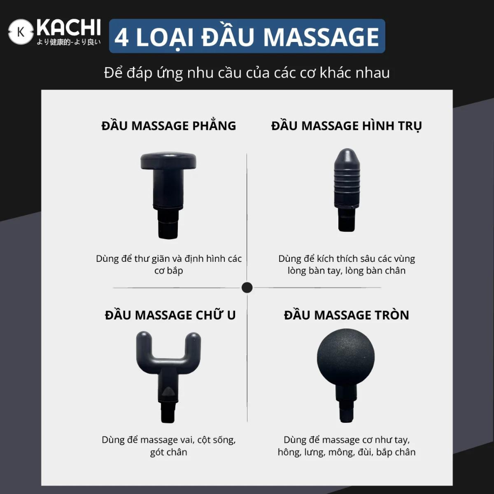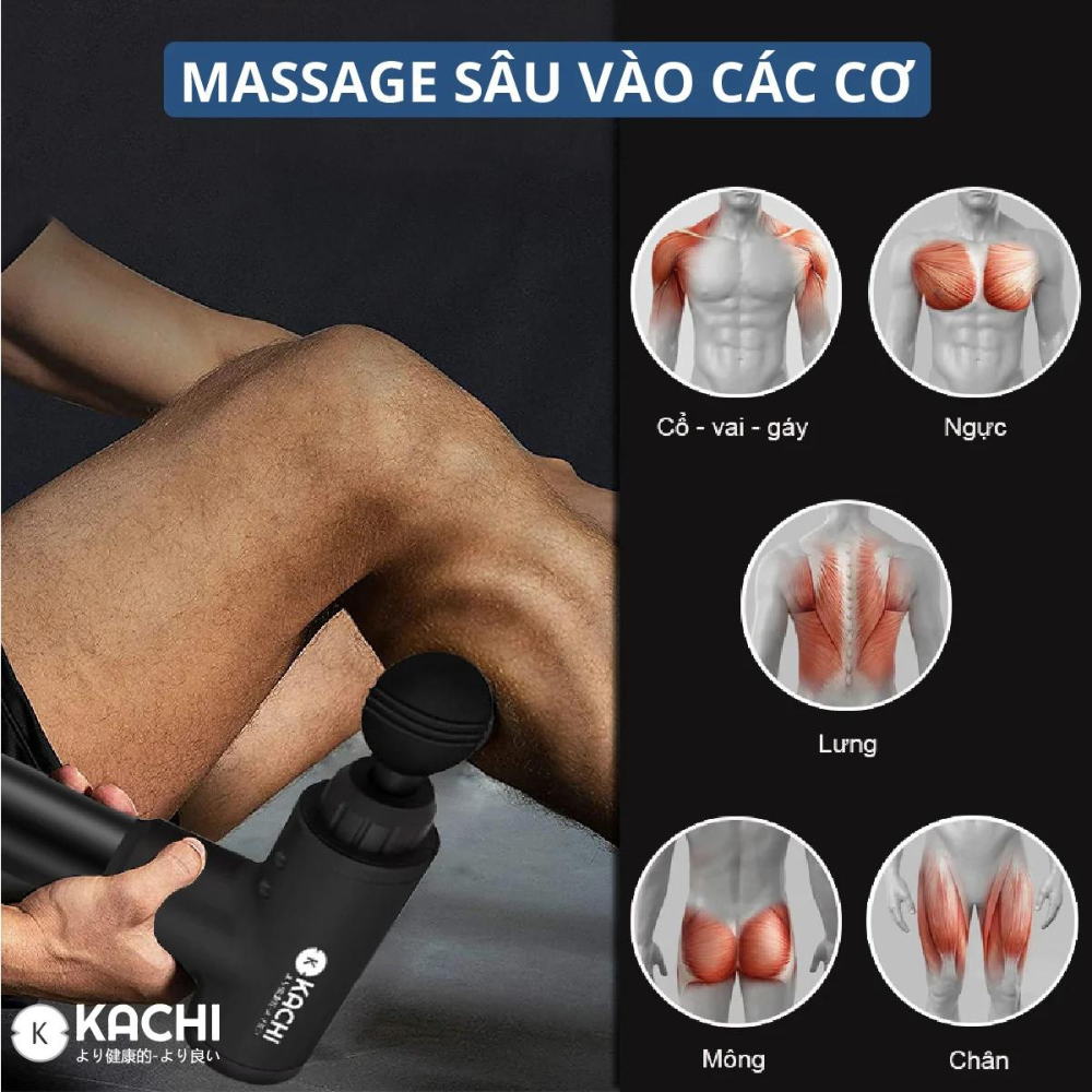 Đặc điểm nổi bật Thiết kế thông minh, nhỏ gọn, dễ dàng mang theo khi đi công tác hay du lịch. Thiết bị sở hữu 4 đầu massage chuyên dụng với các chức năng khác nhau giúp đáp ứng phù hợp nhu cầu sử dụng. Bạn nên massage tối đa 30 phút cho 1 lần dùng để giảm đau, đánh bay mệt mỏi sau những giờ làm việc mệt mỏi, căng thẳng. Thương hiệu Kachi - Việt Nam, sản xuất tại Trung Quốc. Súng massage Kachi MK340 sở hữu 4 đầu massage chuyên dụng với các chức năng khác nhau giúp đáp ứng phù hợp nhu cầu sử dụng - Đầu massage tròn: Dùng để massage cơ tay, hông, lưng, mông, đùi, bắp chân.- Đầu massage chữ U: Phù hợp để massage vai, cột sống, gót chân.- Đầu massage hình trụ: Hỗ trợ kích thích sâu các vùng lòng bàn tay, lòng bàn chân.- Đầu massage phẳng: Giúp thư giãn và định hình các cơ bắp. Súng có 6 mức độ điều chỉnh linh hoạt với tần số rung dao động từ 1000 - 3600 vòng/phút giúp làm dịu các cơ đang bị đau, mang lại cho bạn cảm giác thoải mái, thư giãn nhất Súng massage Kachi MK340 với thiết kế thông minh, nhỏ gọn, dễ dàng mang theo khi đi công tác hay du lịch Vỏ máy được làm từ nhựa ABS bền bỉ, an toàn cho người dùng. Đầu massage có thể tháo rời linh hoạt, dễ sử dụng. Súng massage Kachi MK340 với dung lượng pin lớn, chỉ cần sạc đầy máy trong vòng 2 - 3 giờ Bạn nên massage tối đa 30 phút cho 1 lần dùng để giảm đau, đánh bay mệt mỏi sau những giờ làm việc mệt mỏi, căng thẳng. Súng massage Kachi với 4 đầu massage linh hoạt cùng với thiết kế tay cầm không dây tiện dụng, là lựa chọn sáng giá cho việc giảm đau, căng cứng, chuột rút cơ.Giá sản phẩm trên Tiki đã bao gồm thuế theo luật hiện hành. Bên cạnh đó, tuỳ vào loại sản phẩm, hình thức và địa chỉ giao hàng mà có thể phát sinh thêm chi phí khác như phí vận chuyển, phụ phí hàng cồng kềnh, thuế nhập khẩu (đối với đơn hàng giao từ nước ngoài có giá trị trên 1 triệu đồng).....