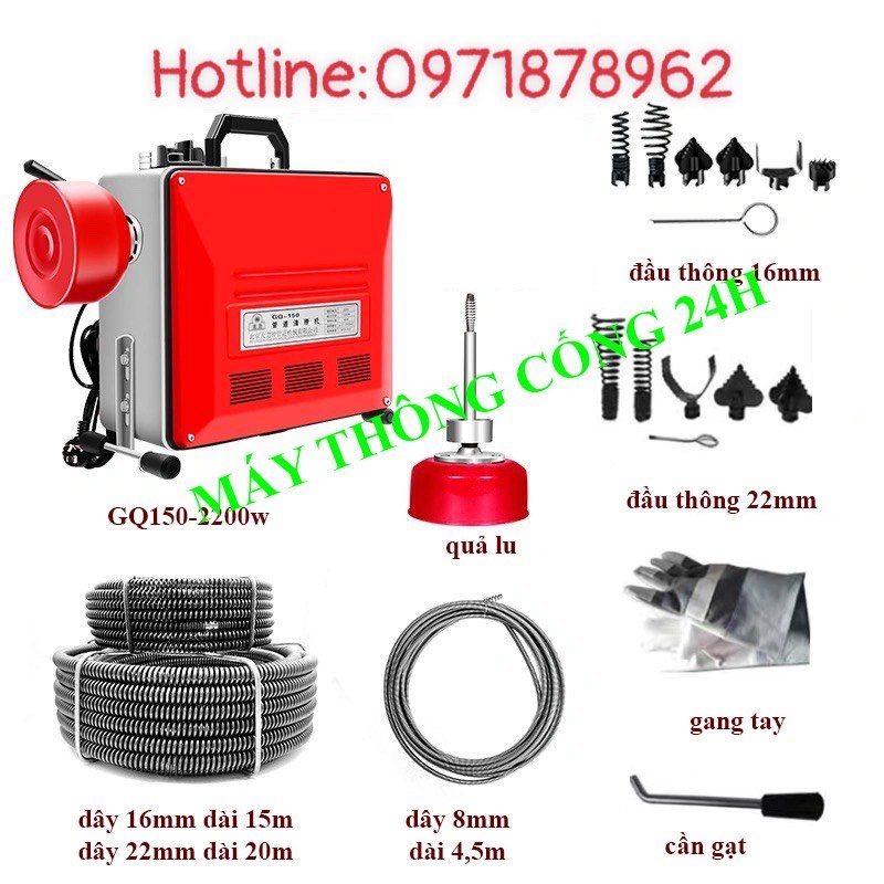 Máy thông cống GQ150-2200w kèm 3 cuộn dây đường kính 8,16,22mm
