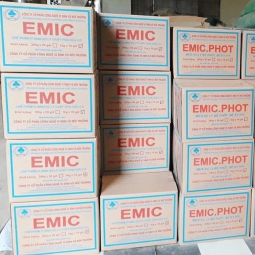 Cách ủ rác thải, phế thải nông nghiệp, mùn bã hữu cơ, phân bắc, phân chuồng làm phân bón cho cây trồng - Hòa 2 gói chế phẩm sinh học xử lý chất thải hữu cơ EMIC 200gr vào 5 - 10 lít nước sạch, tưới đều lên nguyên liệu ủ và đậy kín. - Cứ 2 gói chế phẩm sinh học sử dụng cho 1 tấn nguyên liệu ủ, độ ẩm đống ủ 45 - 50%. - Ủ thành đống sau 10 ngày đảo trộn 1 lần. - Bổ sung nước nếu đống ủ bị khô trong quá trình làm đống và đảo trộn. - Kích thước nguyên liệu càng nhỏ càng tốt, nguyên liệu như cây ngô thì nên chặt thành các đoạn ngắn khoảng 1 gang tay. - Đối với rơm rạ, rác lá khô nên tưới ẩm trước khi ủ ít nhất nhất 12 giờ. - Với bèo Tây (Bèo Nhật Bản), bèo cái thì cần phơi héo trước khi ủ. - Có thể thay phân chuồng bằng bùn bã của các khu chăn nuôi, thực phẩm, mùn hoai. Nếu không có các thành phần trên có thể bổ sung 2 kg đạm/tấn phân ủ. -Thời gian ủ khoảng 25 - 30 ngày. Cách ý nước ao hồ ô nhiễm: - Sử dụng 2 - 4g chế phẩm vi sinh xử lý chất thải hữu cơ EMIC cho 1m^3 nước ô nhiễm.