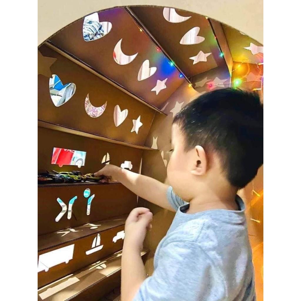 Ngôi nhà giấy được ghép từ các mảnh carton theo thứ tự được đánh dấu sẵn, cực tiết kiệm không gian (khi tháo ra gập gọn dày có 5cm đủ để nhét vào 1 khe tủ nào đó trong nhà) sẽ là món quà tuyệt vời với con trẻ hơn bất kỳ một sản phẩm đồ chơi nhựa hay điện tử nào. Kích thích sáng tạo, bé được tự tay lắp ráp và sở hữu ngôi nhà của riêng mình. Bé tự trang trí theo ý thích của mình từ các mảnh ghép của ngôi nhà, tô màu, dán giấy, decal, sticker từ những hình thù ngộ nghĩnh, Tạo không gian riêng cho các bé tự lập hơn, tự do sáng tạo Bé vừa có chỗ chơi, vừa tạo sự ngăn nắp, gọn gàng dạy bé biết sắp xếp đồ đạc vào đúng chỗ khi chơi xong. Rèn luyện kĩ năng nhóm khi con chơi cùng bạn. --- Đảm bảo sử dụng khớp ghép KHÔNG sử dụng keo, ghim; KHÔNG chất độc hại. KHÔNG có cạnh sắc. Chất liệu carton 5-7 lớp siêu bền, có thể chịu lực lên tới 20 kg. Sản phẩm hoàn toàn không sử dụng bất kỳ linh kiện điện tử hay nhựa nào. 100% không sử dụng giấy Trung Quốc hay giấy tái chế - cực AN TOÀN cho cả trẻ nhỏ --- THÔNG SỐ KĨ THUẬT CỦA NHÀ HỘP CARTON Kích thước khi gập: 90x40x5 Kích thước khi lắp ráp: 97 cm x 85cm x 87 cm Chất liệu: 100% từ bột giấy nhập khẩu Thái Lan sản xuất và thiết kế độc quyền! Hướng dẫn lắp ráp: Sản phẩm đi kèm hướng dẫn lắp ráp và video kèm theo. Giá sản phẩm trên Tiki đã bao gồm thuế theo luật hiện hành. Bên cạnh đó, tuỳ vào loại sản phẩm, hình thức và địa chỉ giao hàng mà có thể phát sinh thêm chi phí khác như phí vận chuyển, phụ phí hàng cồng kềnh, thuế nhập khẩu (đối với đơn hàng giao từ nước ngoài có giá trị trên 1 triệu đồng).....