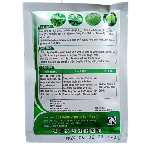 Phân bón lá npk 33-11-11+Te bung đọt ra rễ cực mạnh gói 100g Thành phần : + N : 33 + P : 10 + K : 10 + Thành phần vi lượng : Zn 150ppm; Fe 100ppm; Cu 100ppm; B 150ppm Công dụng Phân bón lá 33-11 : + Tạo tán cho cây, đi tượt bung đọt mạnh, xanh mướt lá + Bật chồi nhanh, ra rễ mạnh + Ngoài ra phân bón lá 33-11 còn giúp Ngăn ngừa và khăc phục : xoăn lá, vang lá, vang lá sớm, cháy lá, bac lá, thối trái-củ-quả, rụng lá, cây còi coc , chêt ngọn-cành Cách sử dụng : + Pha 20 gram cho 20 lít nước + Dùng định kỳ 10-15 ngày / 1 lầnGiá sản phẩm trên Tiki đã bao gồm thuế theo luật hiện hành. Bên cạnh đó, tuỳ vào loại sản phẩm, hình thức và địa chỉ giao hàng mà có thể phát sinh thêm chi phí khác như phí vận chuyển, phụ phí hàng cồng kềnh, thuế nhập khẩu (đối với đơn hàng giao từ nước ngoài có giá trị trên 1 triệu đồng).....Sản phẩm này là tài sản cá nhân được bán bởi Nhà Bán Hàng Cá Nhân và không thuộc đối tượng phải chịu thuế GTGT. Do đó hoá đơn VAT không được cung cấp trong trường hợp này.